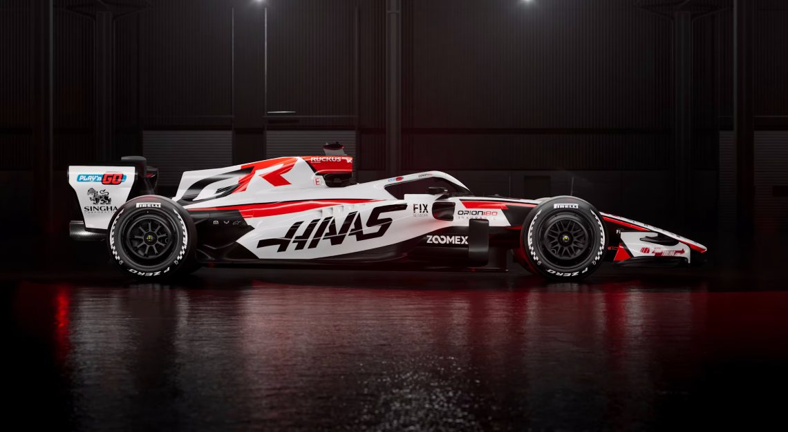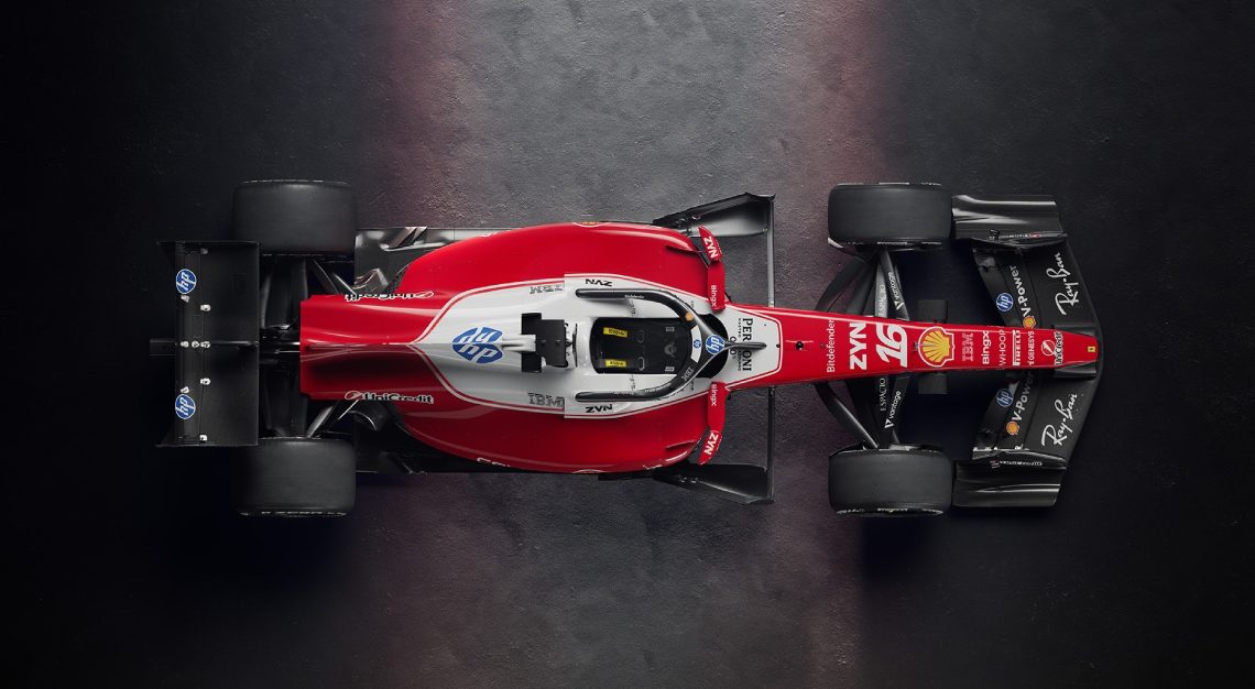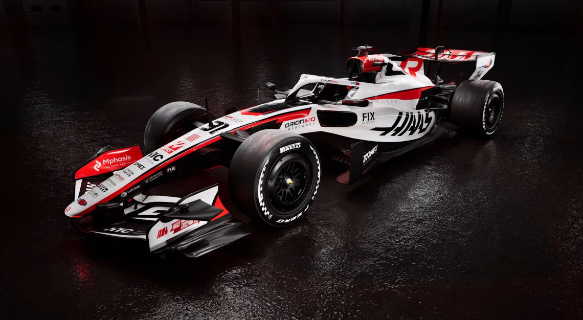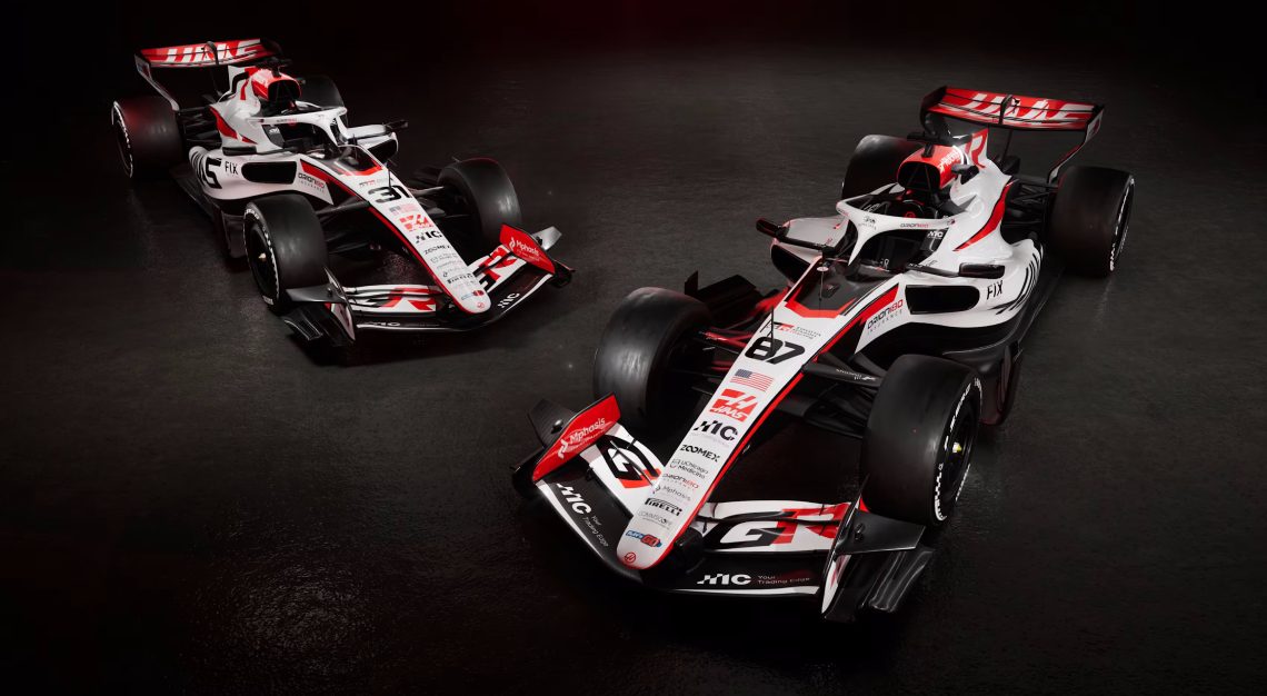 Haas keeps it crisp, loud, and unmistakably on-brand: a clean white base anchored by black along the lower bodywork, then sliced through with sharp red flashes that run from the nose and cockpit area through to the engine cover. The hero move is typography: an oversized HAAS wordmark sprawled across the sidepods, while the red-and-white graphic treatment on the rear wing and a cheeky Stars-and-Stripes hit on the nose underline the team’s all-American identity.