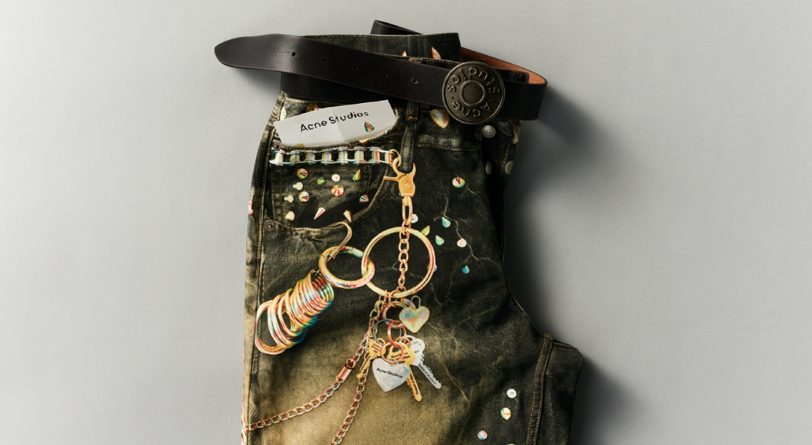 Our top pick, the trompe-l’oeil denim boasts a relaxed silhouette with gold keychains and heart key charms, a key feature of the Y2K fashion. A matching tote bag continues the trompe-l’oeil narrative.