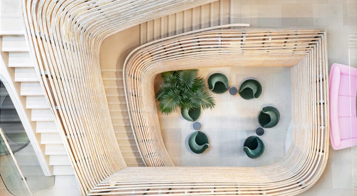Spanning some 6,034 square metres, Arc Beverly includes collaborative work areas, lounge spaces, private offices, conference rooms, a screening room, and two rooftop terraces. Accentuating the building’s unique architecture, the interior is decked out with warm wood, pale tiles, and midcentury decor. It is also adorned with a sculptural wooden staircase by BA Collective, custom furnishings by wHY Architecture, and curated artworks, creating a refined yet cozy feel.