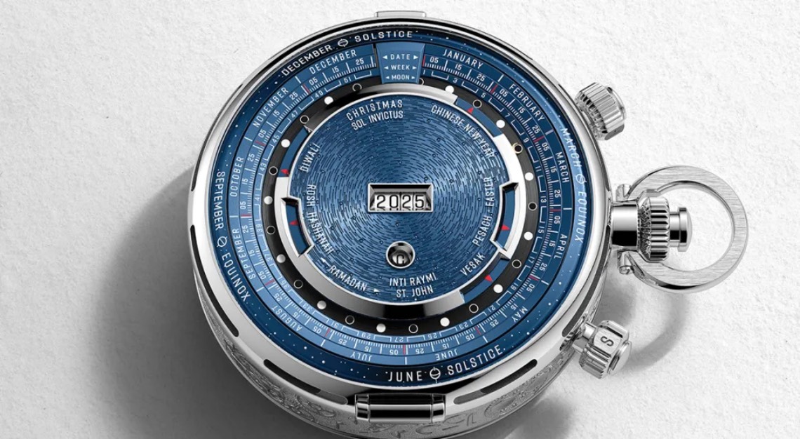 Effectively a mechanical calculator, this complication—operating independently from the new movement—uses the Gregorian calendar as a reference to coordinate solar, lunar, and lunisolar cycles via eight complications including 18 indications such as: year, leap year, month, date, week number, moon phase, and seasonal markers like solstices and equinoxes. It can also tell you the dates of nine cultural celebrations: Christmas, Saint John’s Day, Ramadan, Diwali, Rosh Hashanah, Pesach, Vesak, Easter, and Chinese New Year. All is controllable via a simple bidirectional wheel that resets the indications instantaneously and remains synchronised from 1900 through 2099.