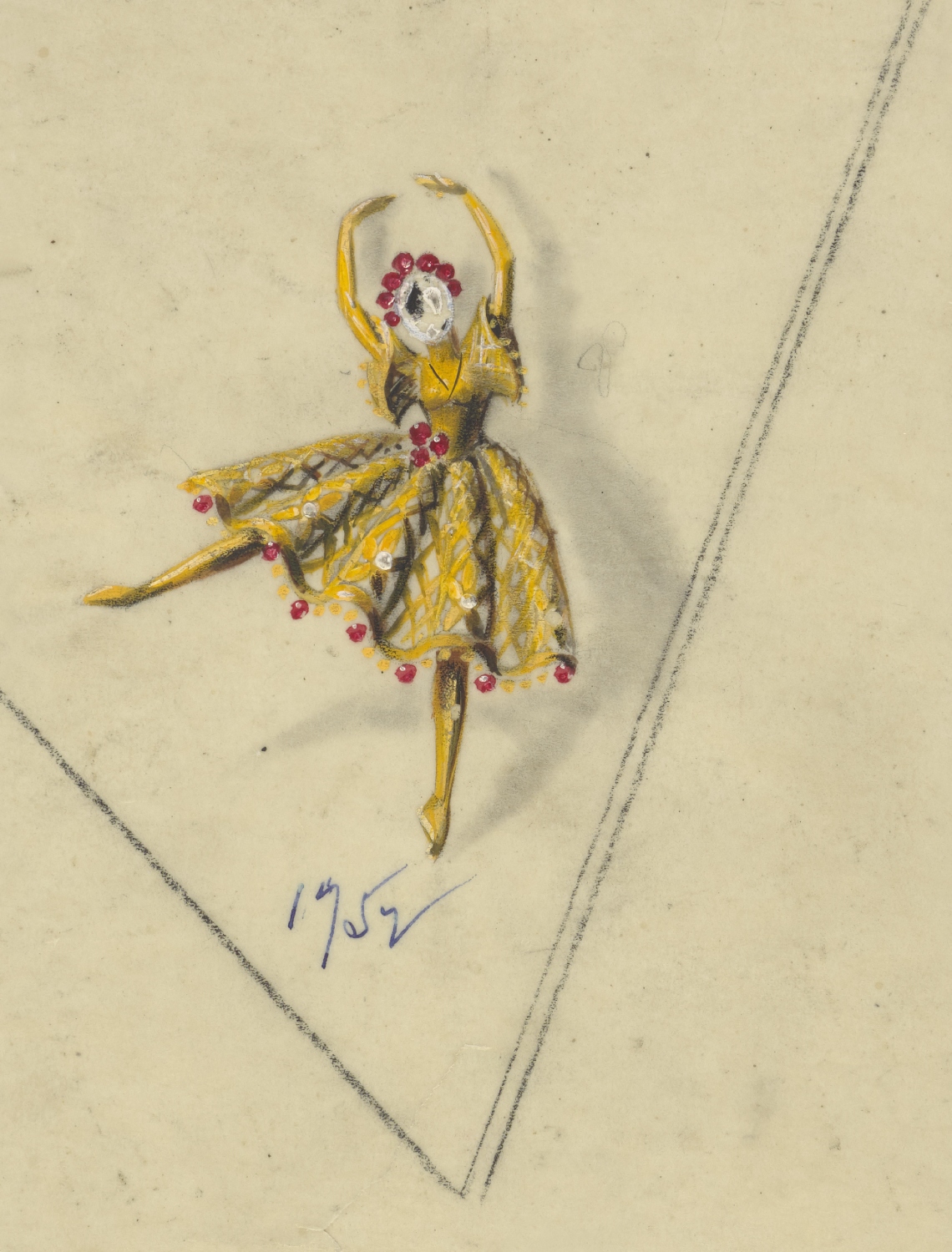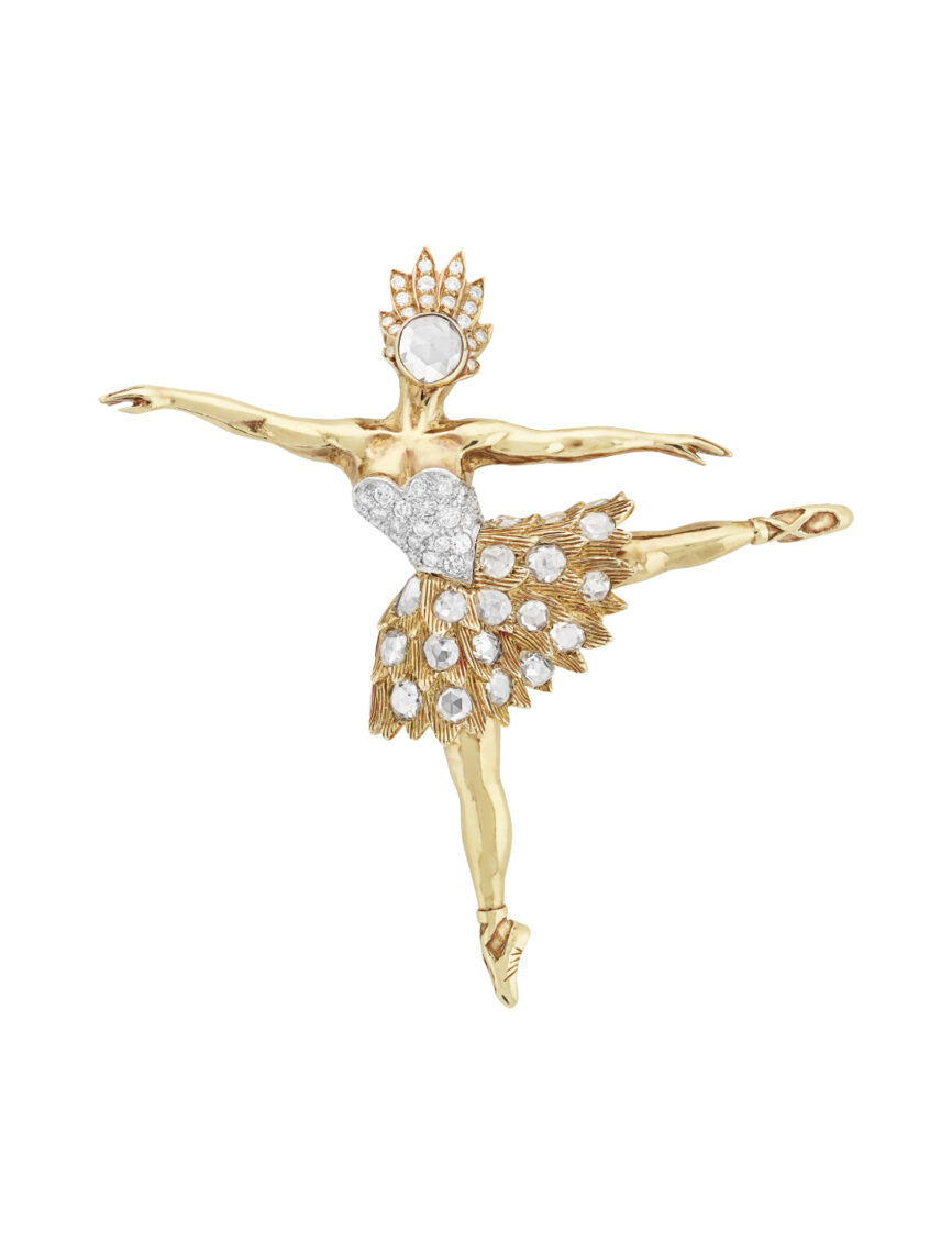 Among the most evocative works on display is a piece from 1967 inspired by Suzanne Farrell in the Diamonds segment of George Balanchine’s ballet Jewels. Here, the jewellers focus as much on the athleticism of the body as on costume: the curve of the slipper, the folds of the leg, and the elongated arms and limbs all reflect close observation of rehearsals. The diamond-set tutu, lined with engraved rays, appears light and fluid in motion, its texture echoing the fall of a stage curtain.
