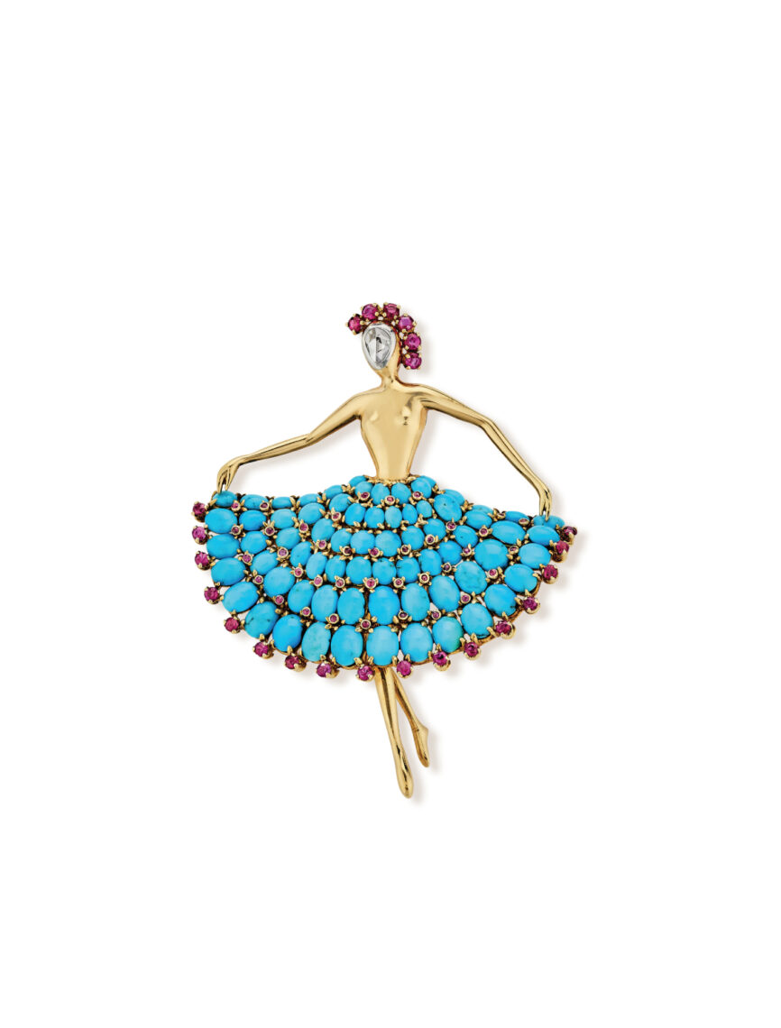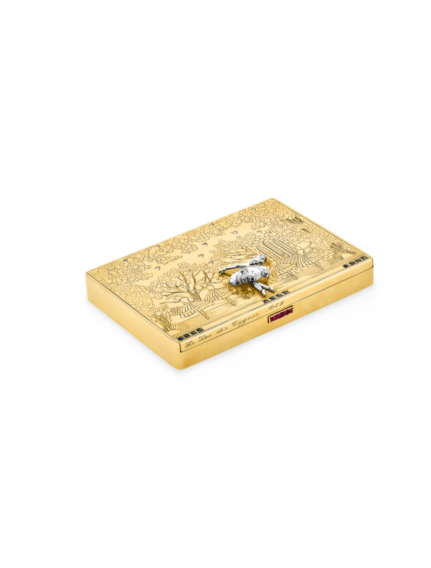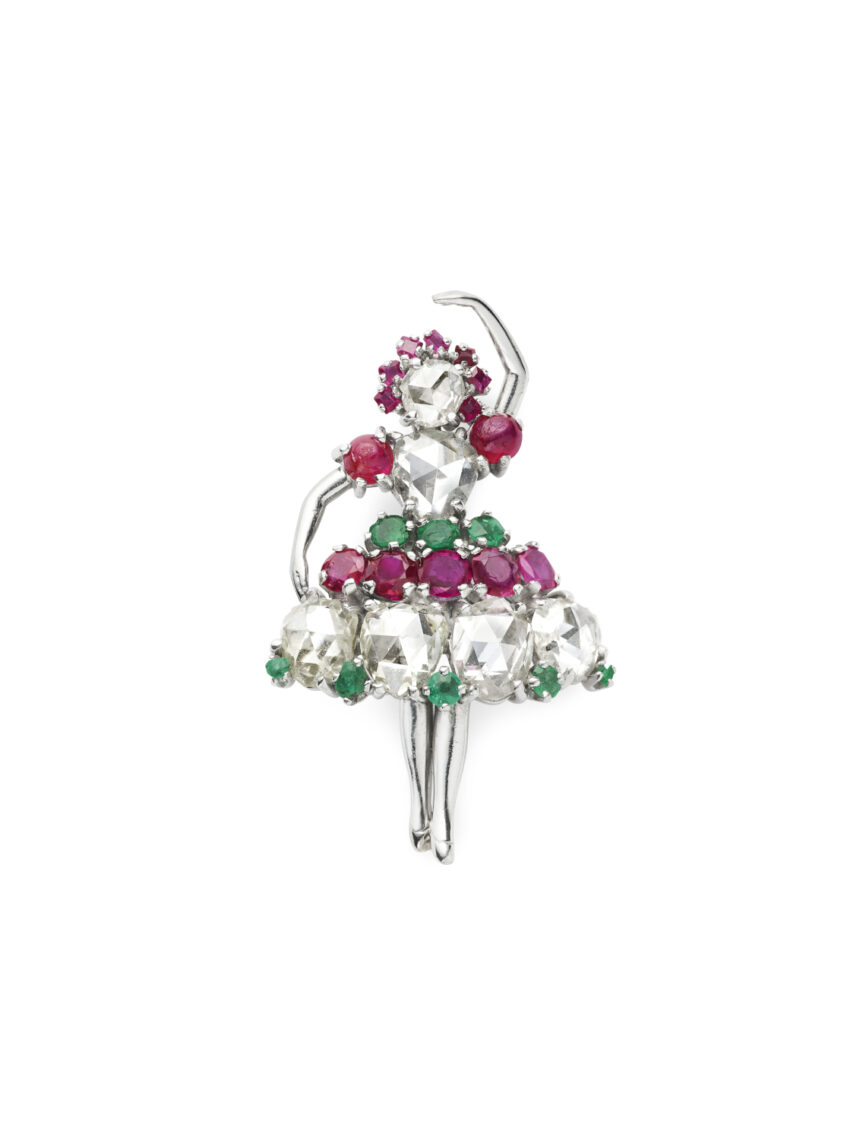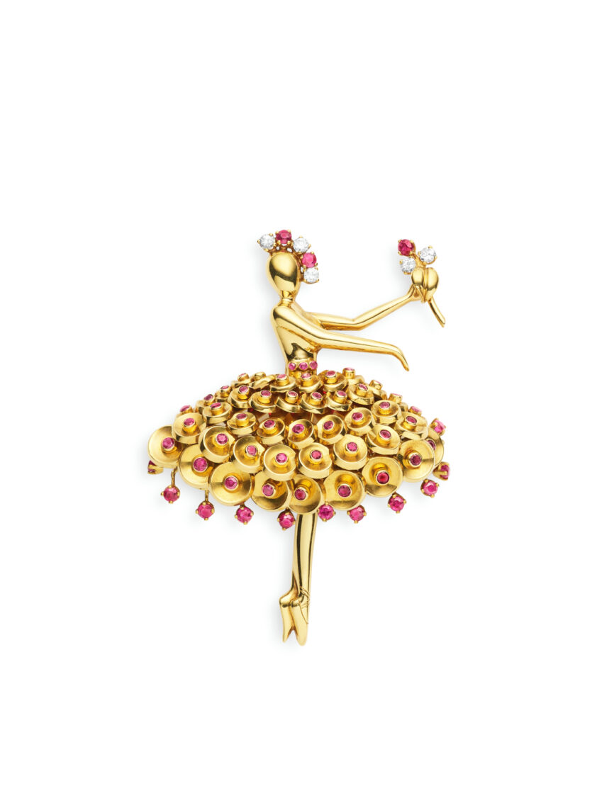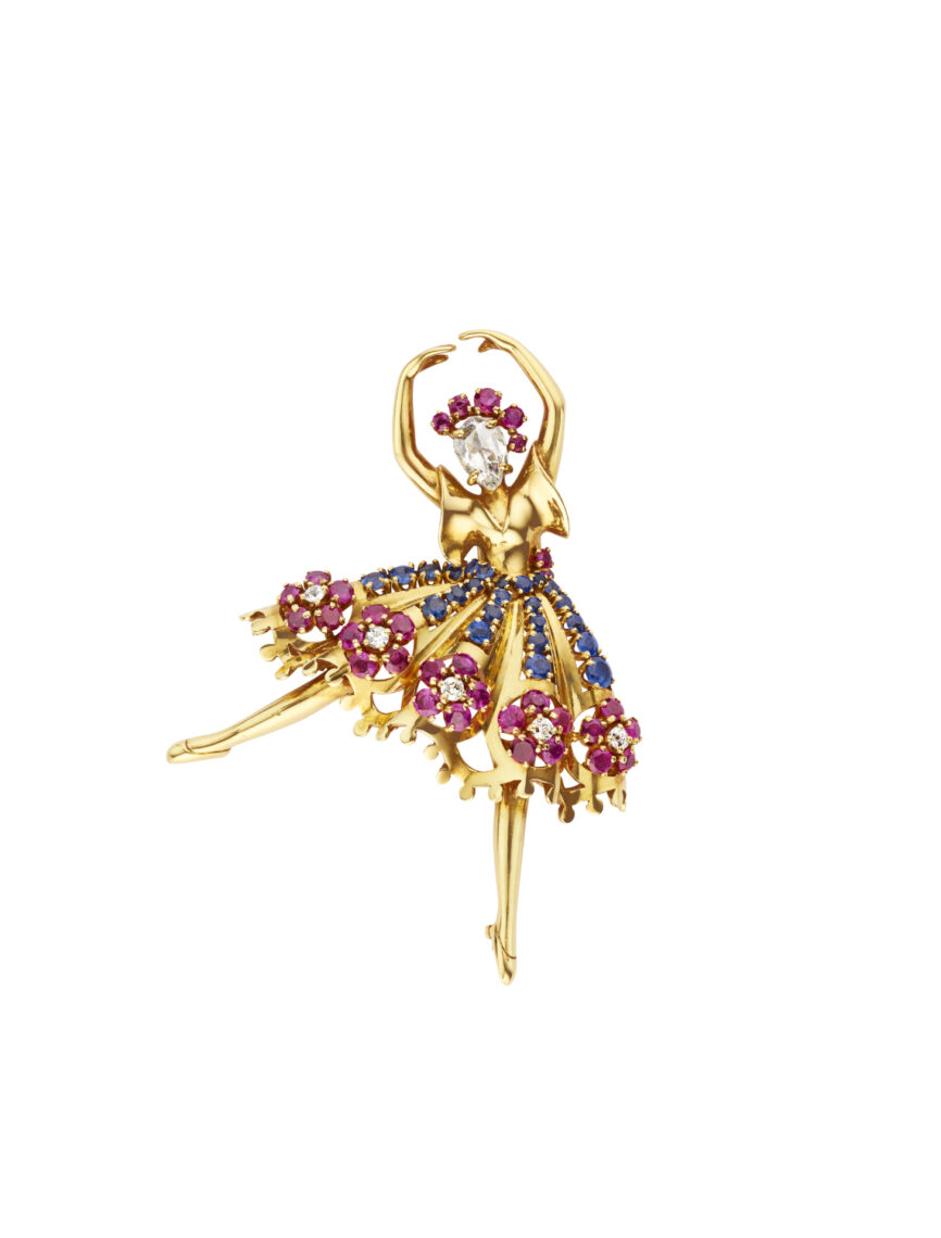 The exhibition also traces the evolution of the ballerina motif beyond brooches to rectangular powder cases engraved with ballet scenes and centred with dancers set against enchanted backdrops. A 1946 Swan Lake example in yellow gold, rubies, sapphires, and diamonds immortalises Tchaikovsky’s most famous ballet, with the dancer’s raised arms echoing the poised curve of her legs.