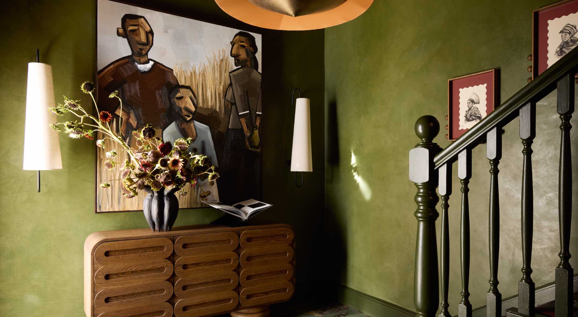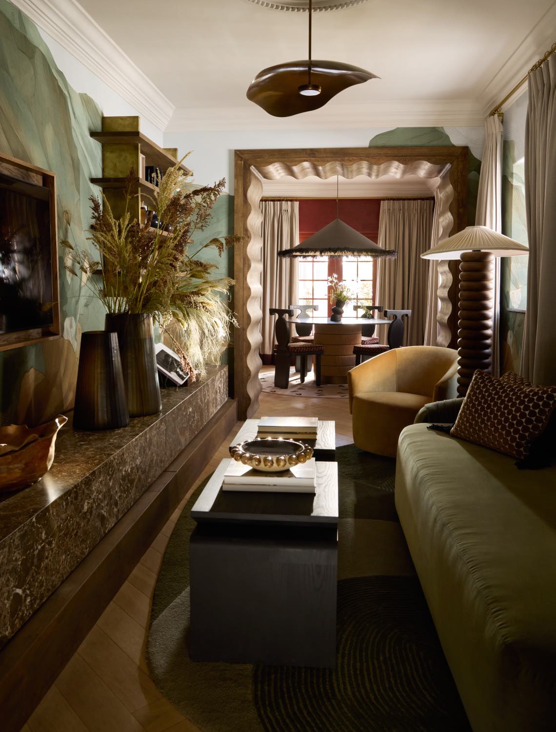 Brimming with elements such as a bespoke dining pendant inspired by the Basotho hat from Magugu’s lineage and handcrafted dining chairs shaped by the curves of traditional pottery, the space is imbued with cultural charm. Accentuating this effect further is a hand-sketched panoramic wallpaper that traces South African landscapes from the Midlands to the Cape.
