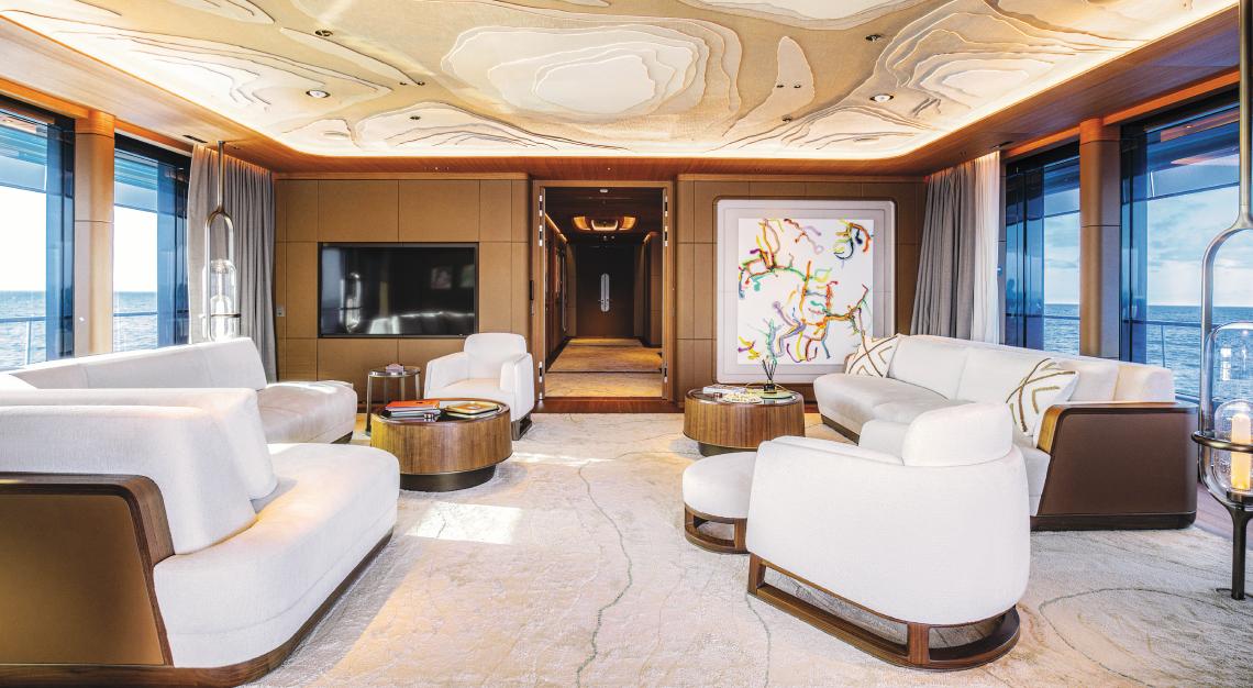 The project involved 150 contractors—including 35 welders—working during the height of COVID. The square footage of the top deck nearly doubled, with a massive hardtop added as the yacht’s new crown. Among the other significant changes, the owner’s suite expanded and the spa area was supersized. H2 Design and Malouf’s wife, Larissa, used off-white hues, thick carpeting and contemporary furniture to give the new Coral Ocean a modern feel that supported the structural alterations. In the end, what could have been a design disaster wound up penning the next chapter for this iconic vessel.