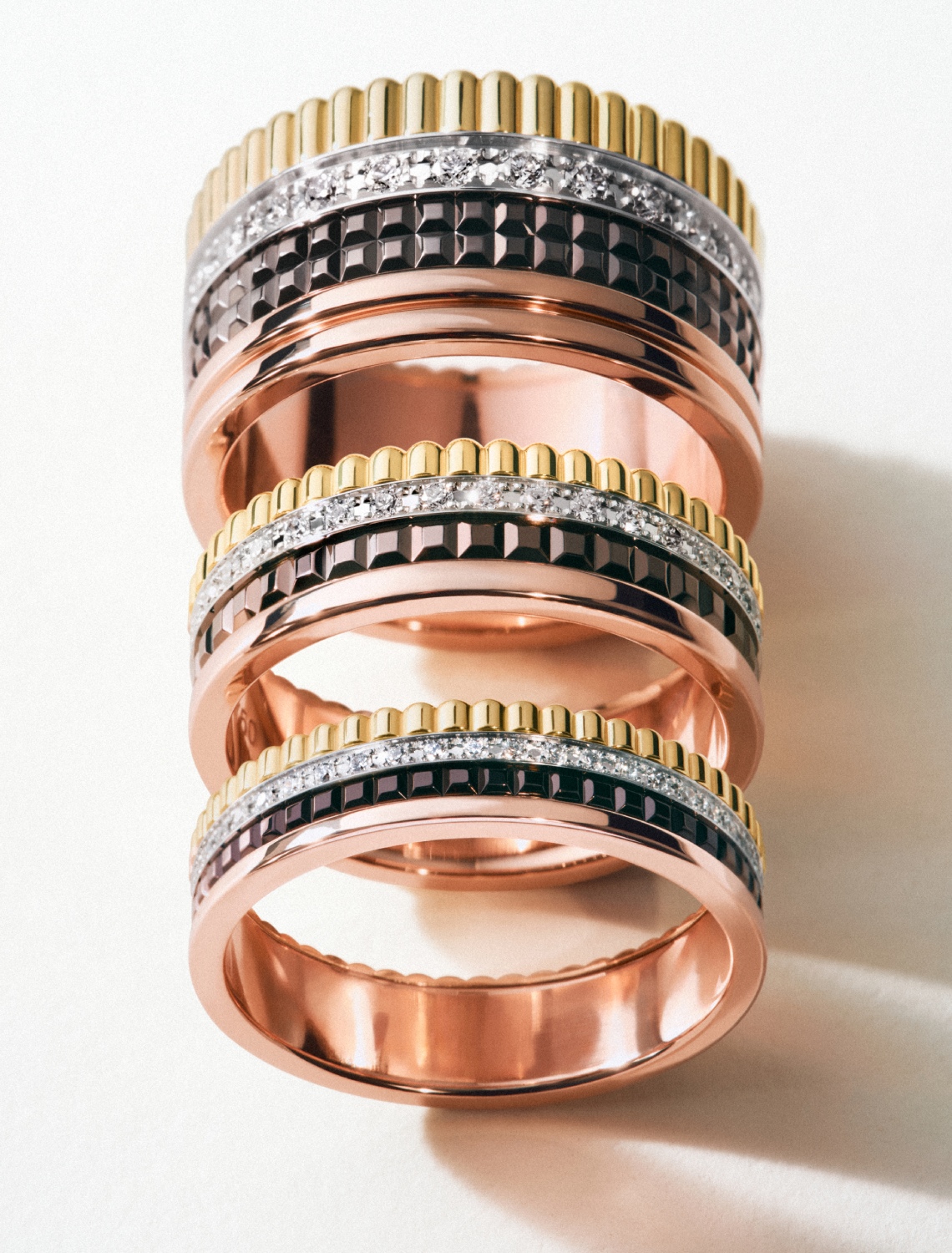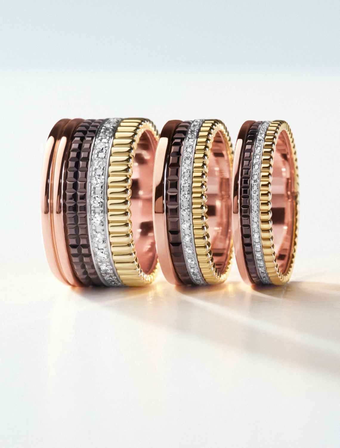 Since its debut in 2004, the Quatre ring has been defined by four stacked bands, each drawing on the maison’s signature design codes: architectural lines, the cobblestones of Place Vendôme, couture-inspired ribbons and a row of diamonds. Together, these elements form a single graphic statement on the hand, instantly recognisable as Boucheron.