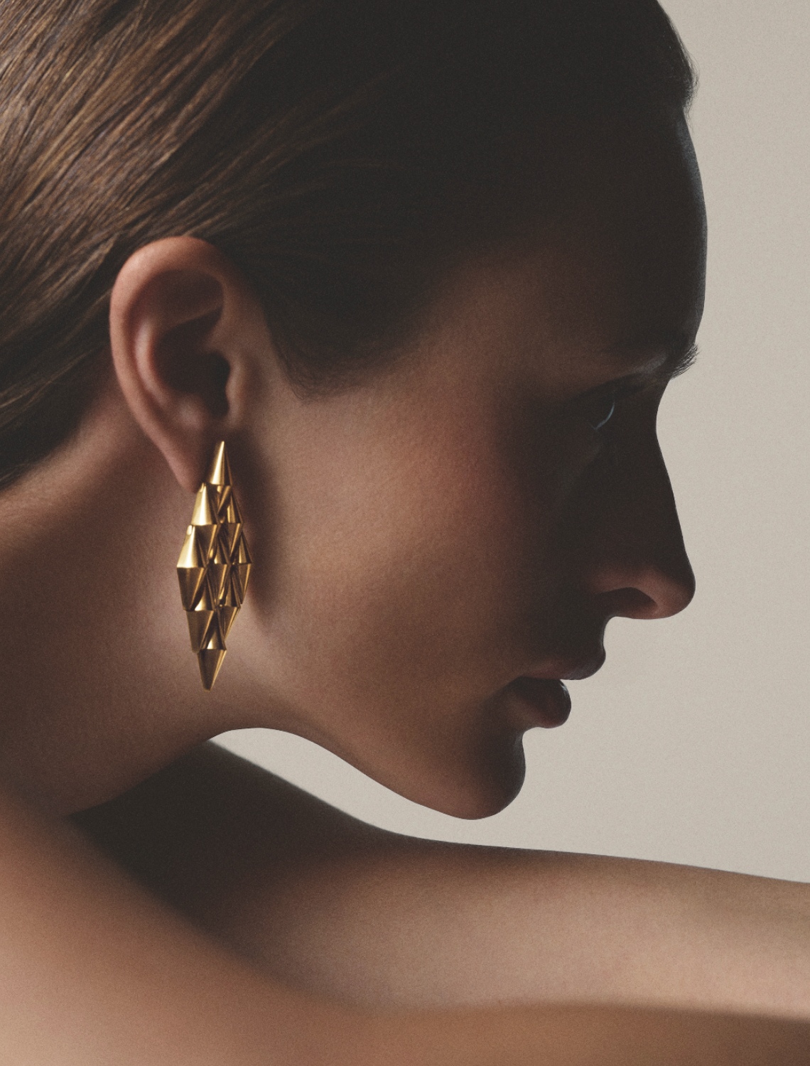 Verticality is explored through dangling earrings, where modular grids amplify the warmth of Bvlgari’s yellow gold. Photo by Bvlgari