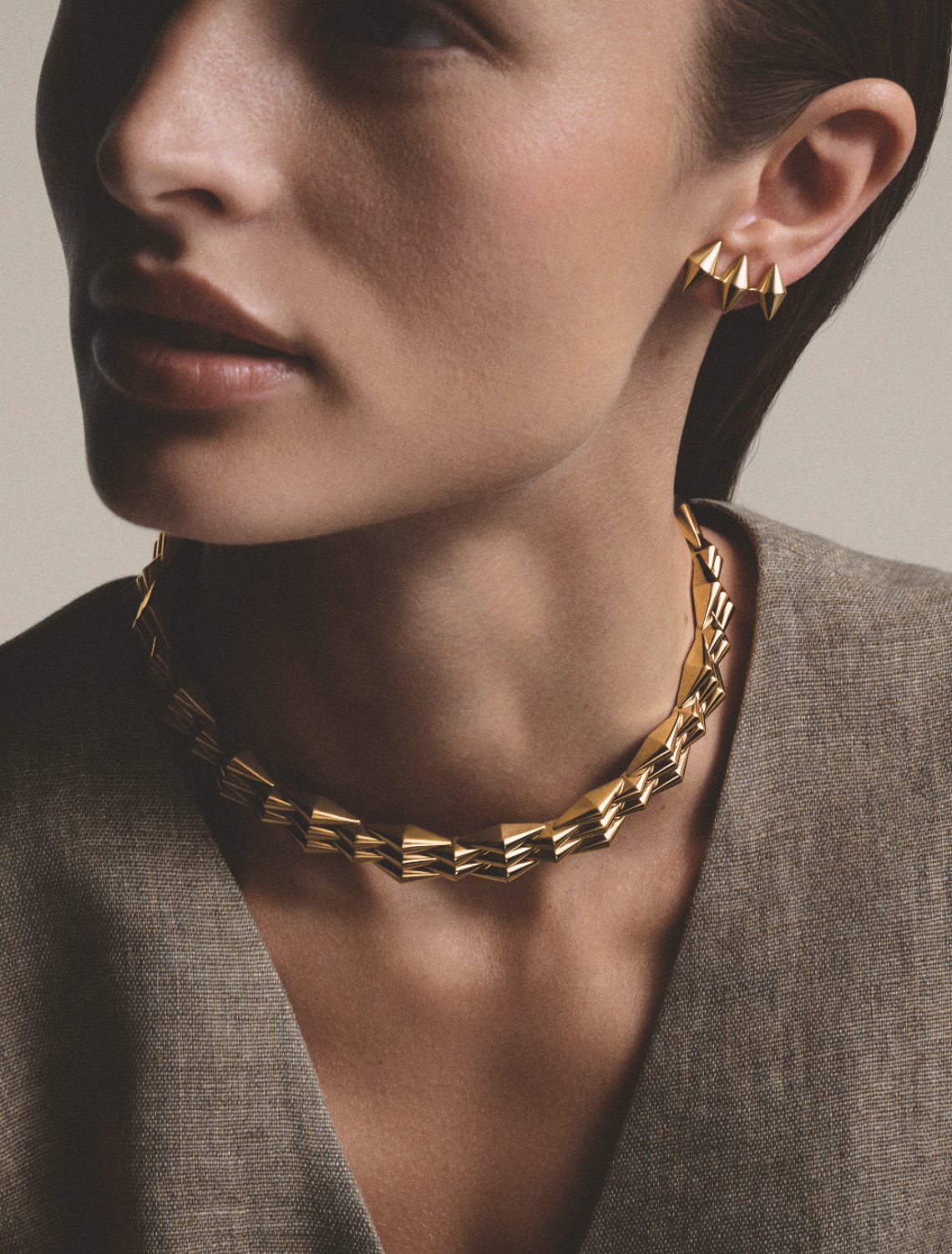 The ring takes the form of a collapsible five-band construction—part signet, part stack, and entirely contemporary. Verticality is explored through dangling earrings, where modular grids amplify the warmth of Bvlgari’s yellow gold, alongside a single ear cuff elevated to high jewellery status.