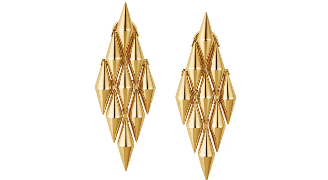 The rebirth of Vimini is a faithful tribute to its precursor. In fact, the bracelet is nearly an exact replica, underpinned by more elevated, modern craftsmanship. The ring and necklace follow the same structure, with rhombus-shaped gold elements stacked to create a woven effect. A pair of statement earrings repeats the style in articulated, dangling forms, while a second set is fashioned as ear climbers for a more casual expression.