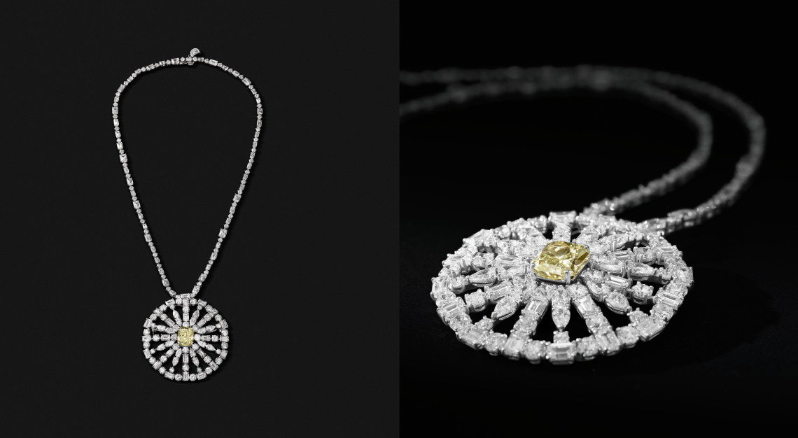 The Aethernitas necklace pays homage to the Eternal City. Inspired by the symmetry of the Pantheon’s dome and the grandeur of St Peter’s Basilica, the jewel features a striking 5.01-carat fancy yellow-green diamond set within a circular pendant that can also be detached and worn as a brooch.