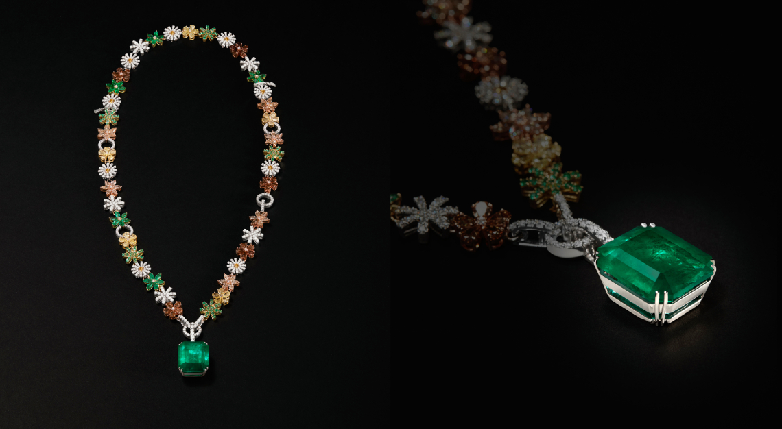 At its centre is a remarkable 31.46-carat Colombian emerald in a vivid green “Muzo” hue, surrounded by an intricate arrangement of emeralds and diamonds in a variety of cuts. Delicate floral motifs, including daisies, appear throughout the composition, echoing the romantic imagery of medieval times. Demonstrating Damiani’s craftsmanship, the necklace can also be transformed into two separate pieces: a shorter necklace and a bracelet.