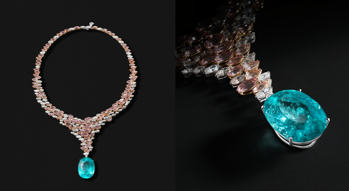 Among the highlights is the Marea Rosa necklace, a fluid composition in white and pink gold that evokes the gentle movement of waves along the Sardinian coast. At its centre lies an extraordinary 46.71-carat Paraiba tourmaline, its vivid greenish-blue hue recalling the crystalline waters of the Mediterranean. Marquise-cut morganites and diamonds shimmer across the design like sunlight dancing on the sea, while an intricately crafted box clasp hidden at the back reveals the meticulous artistry behind the jewel.