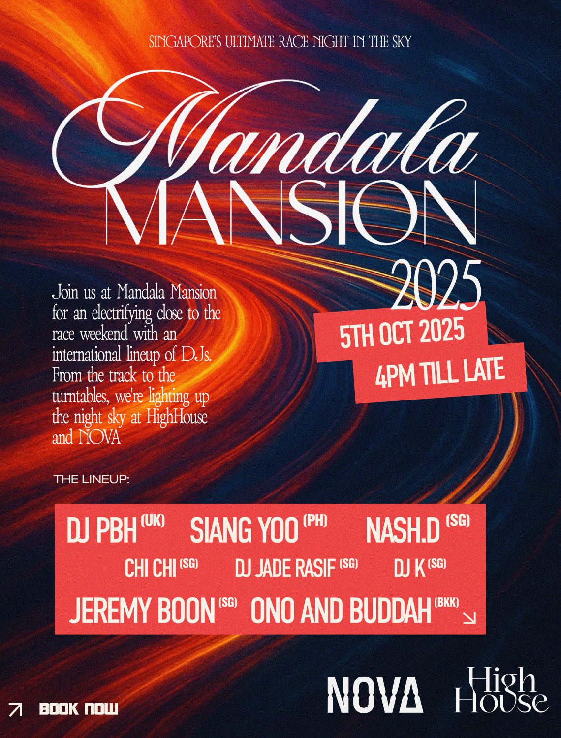 When the chequered flag drops on Sunday night, Mandala Club will take over the clouds. On 5 October, Mandala Mansion sweeps across HighHouse and Nova at One Raffles Place from 4pm till late, pairing 360-degree views with an all-night programme built for maximum afterburn. The HighHouse stage is led by British R&B star Jay Sean, with PBH (UK), Siang Yoo (Philippines), and local favourites Nash.D and ChiChi keeping the energy on boil. Up above at Nova, Jade Rasif, and Thailand’s duo Ono & Buddah headline, flanked by DJ K and Jeremy Boon for a big-room house and EDM push that goes long after the fireworks. Expect six hours of free-flow: premium pours, canapés, caviar and a gourmet spread by the HighHouse team—folded into a high-production setting that turns Singapore’s skyline into your light show. Tickets are available online; dress smart-casual, and note that after-hours entry is 18+. This is the race weekend’s cheeriest parc fermé.