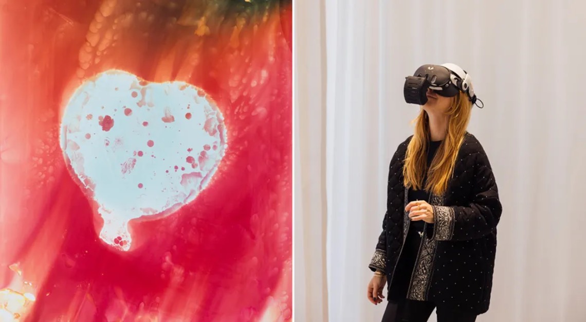 Left: an image from “Expanded Drops,” a series of photographs by Christelle Boulé. Right: a visitor experiences “V-Scent,” for which Kurkdjian developed a special VR headset. Photo by Maison Francis Kurkdjian