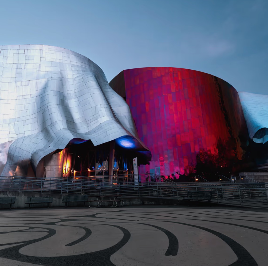 Gehry became the first-ever architect to use Computer Aided Three-Dimensional Interactive Application in the creation of the Museum of Pop Culture in Seattle. Inspired by the energy, movement and fluidity of pop culture, this one-of-a-kind visual experience is cloaked in 21,000 individually cut and shaped steel and aluminium shingles. They respond to changes in light conditions and appear to shift when viewed from different angles, serving as a reminder that music and culture will forever be evolving.