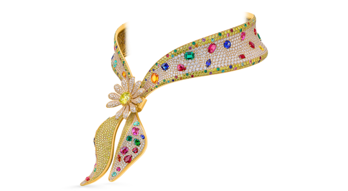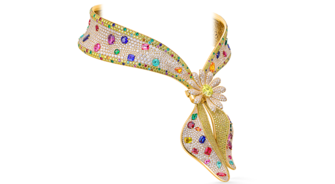 Measuring 16.5 inches, the aptly named Bandana Royale is fully pavé-set with 94.3 carats of white diamonds (2,061 stones) and 44.8 carats of canary yellow diamonds (857 stones). It is also adorned with 54.6 carats of large colored gems and 10.6 carats of small colored gems. The vibrant rubies, emeralds, sapphires, and tourmalines reflect G-Dragon’s eclectic aesthetic, according to Jacob & Co. At the center lies a jeweled version of his famous daisy motif, or “G-Daisy,” with a 5.4-carat brilliant-cut fancy yellow diamond surrounded by diamond-encrusted “petals.” The G-Daisy always has one missing petal, symbolising the beauty of imperfection.