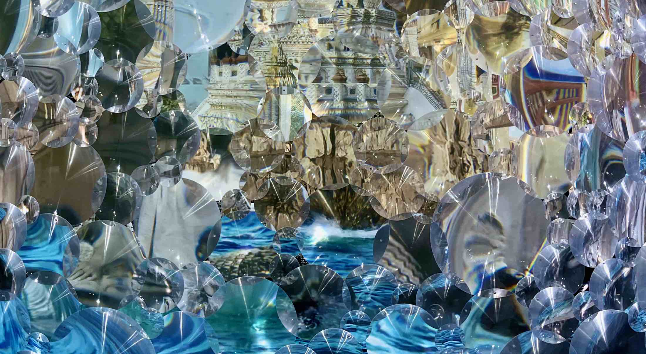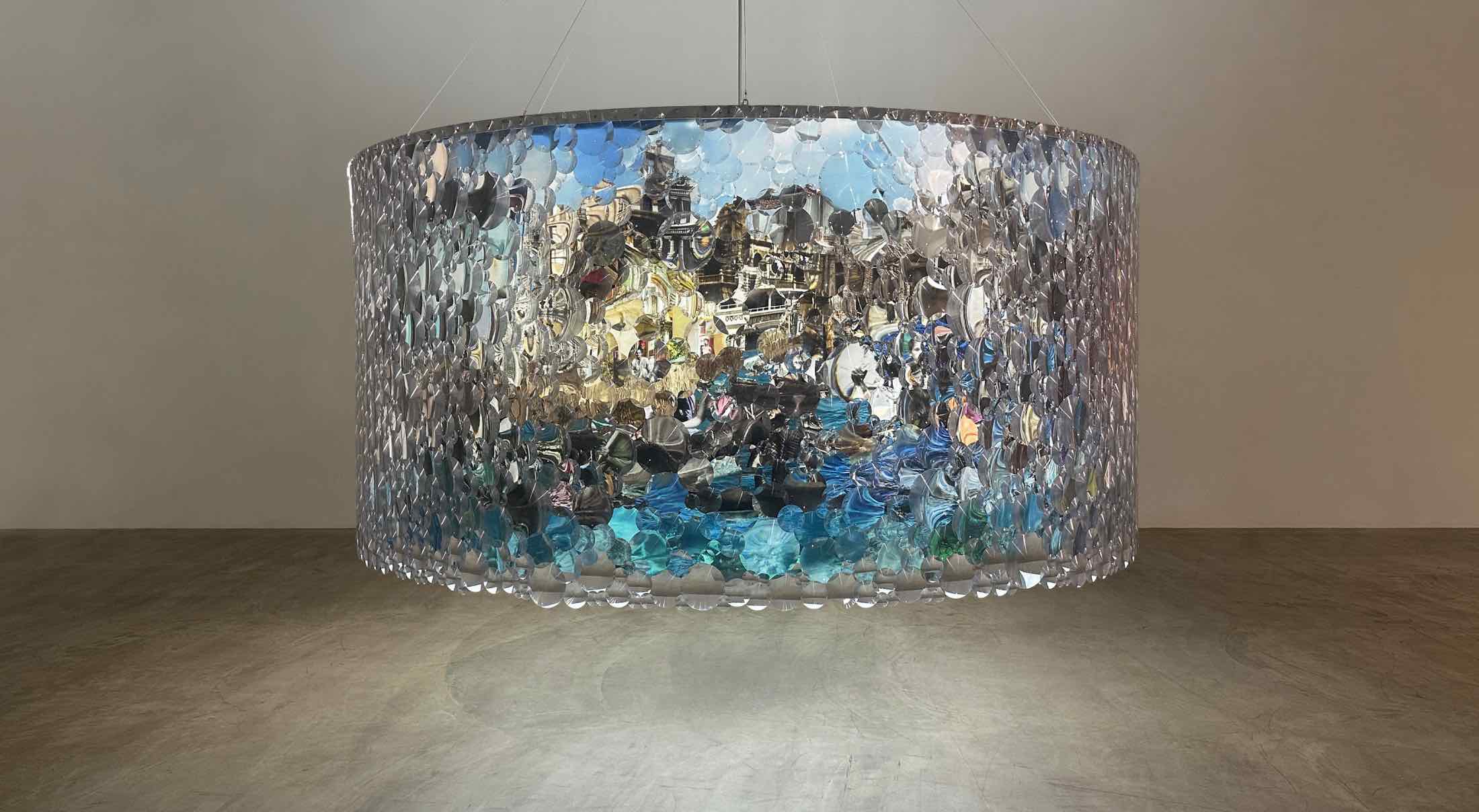 The kinetic work measures 3.6m in diameter and comprises a slowly rotating photographic panorama positioned behind a ring of Fresnel lenses, producing a shifting field of refracted images that changes according to the viewer’s movement around the work.