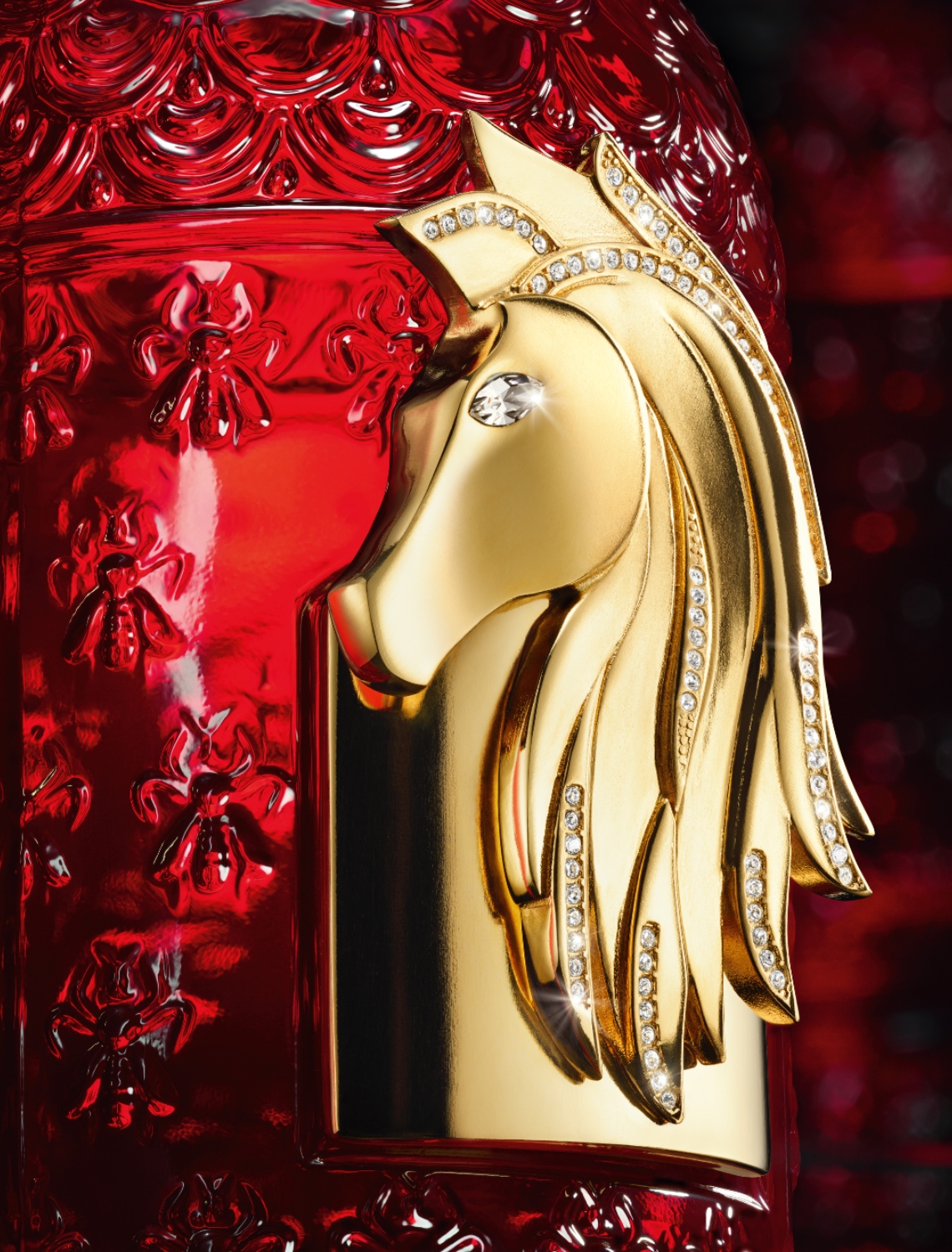 Crowning the bottle is its most striking flourish: a majestic horse’s head, sculpted with exacting detail and gilded in 24-carat gold. The ornament is hand-set with 79 Swarovski crystals—an almond-cut crystal forming the eye, with 78 round crystals flowing along the mane—underscoring the seamless dialogue between high jewellery and fine perfumery. A delicate golden cord, hand-tied by Guerlain’s Dames de Table, completes the piece.