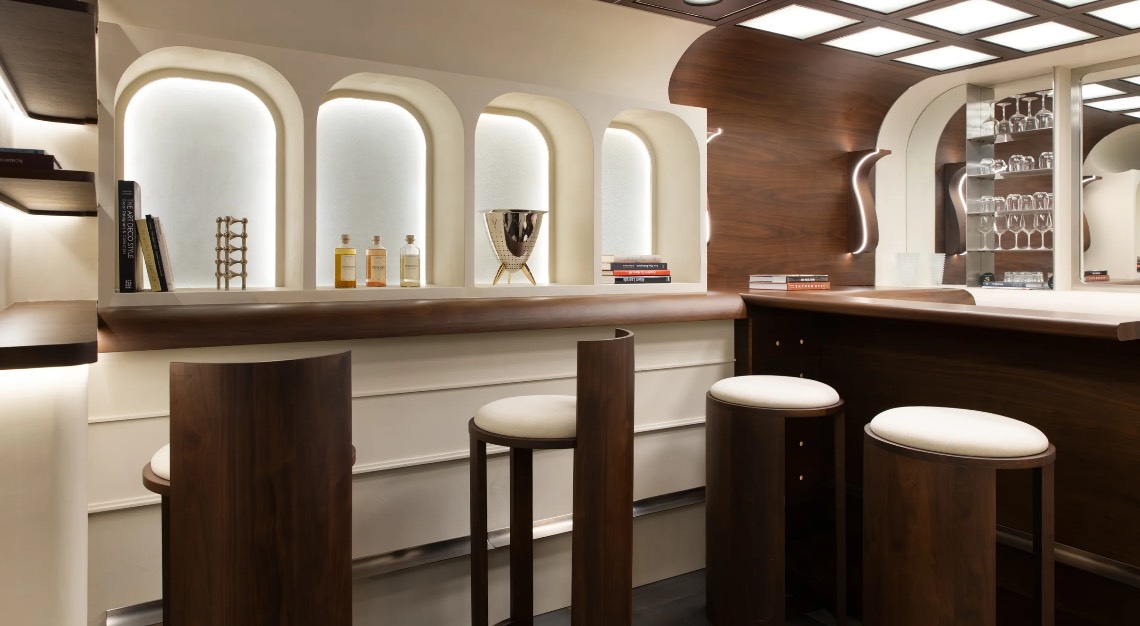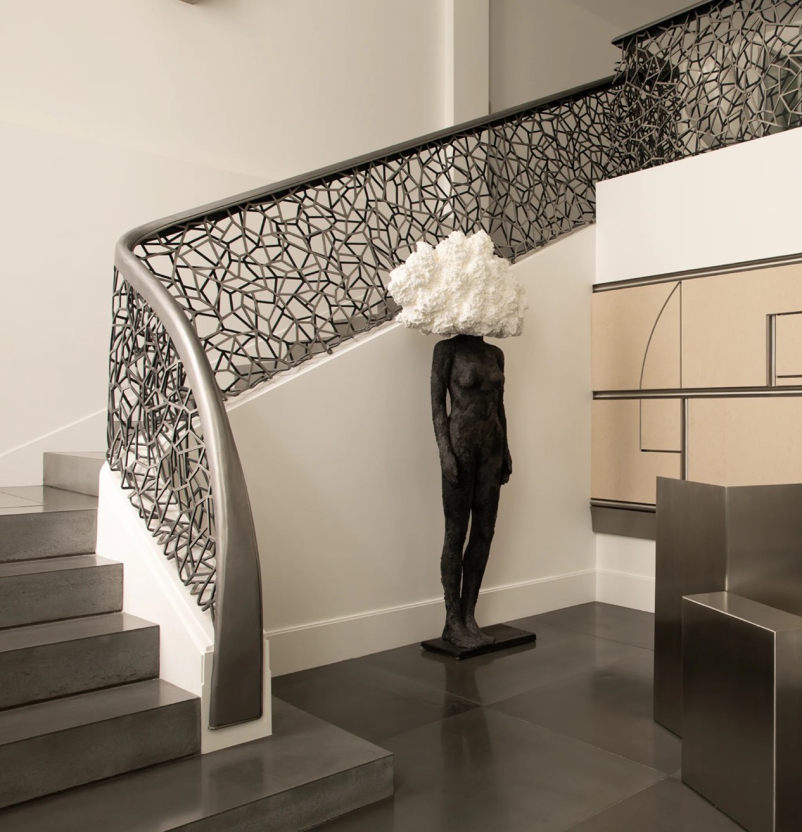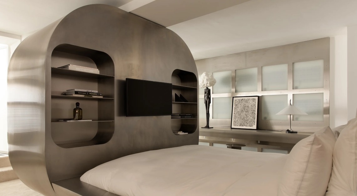 Located in Saint-Germain-des-Prés, in an early 19th-century building that’s just steps from Serge Gainsbourg’s former home, the three-storey space has been transformed into a multi-level residence by French interior designer Pauline Leprince. Good for a party of four, Saint-Germain I welcomes guests into a restrained palette of steel and ivory, complete with soaring ceilings and twin steel bookcases that point to Lagerfeld’s love of books. Two bedrooms sit above a living room, its two kitchens and bar, and below, a wellness area with a sauna and hammam ensures your day ends on a relaxing note. Anchoring the home, though, is the dramatic staircase, secured by a sculpted steel bannister by Australian industrial designer Marc Newson and Lagerfeld himself.