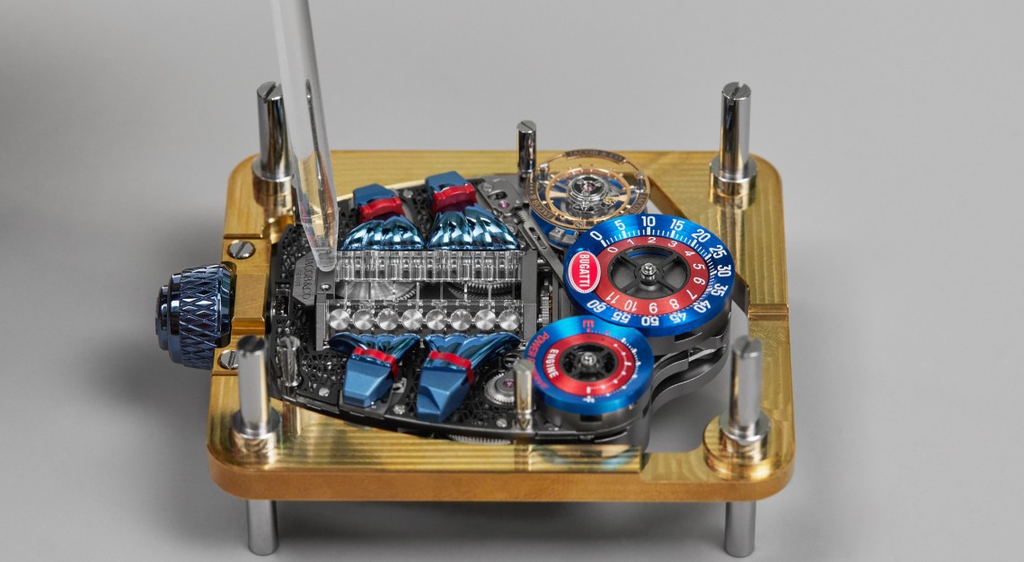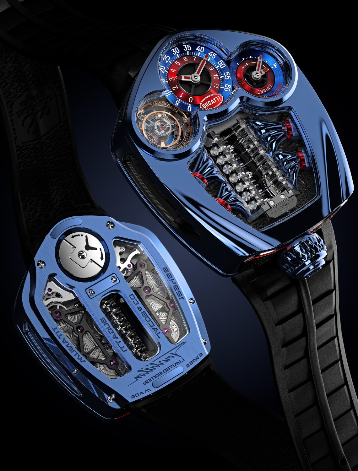 Limited to 150 pieces, the Bugatti Tourbillon Blue PVD Titanium is the horological equivalent of Bugatti’s mid-engine hybrid hyper sports car, which is also named Tourbillon. The watch features a captivating automaton that mimics the car’s naturally aspirated V-16 engine, with pumping gears and pistons that can be activated on demand.