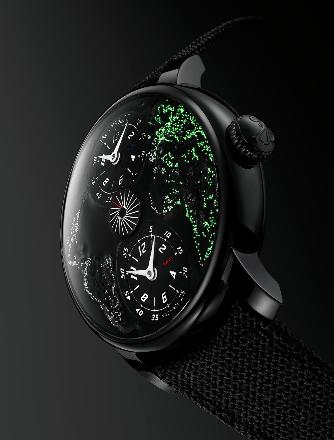 Last but not least, another timepiece that is not to be missed is the World Is Yours Dual Time Zone (MAD Paris edition). This 101-piece limited edition in a black DLC stainless steel case reimagines the brand’s dual-time complication, depicting continents crafted on a black titanium dial that is stamped, engraved, and filled with hundreds of Super-LumiNova dots that evoke the night view of city lights from an aircraft.