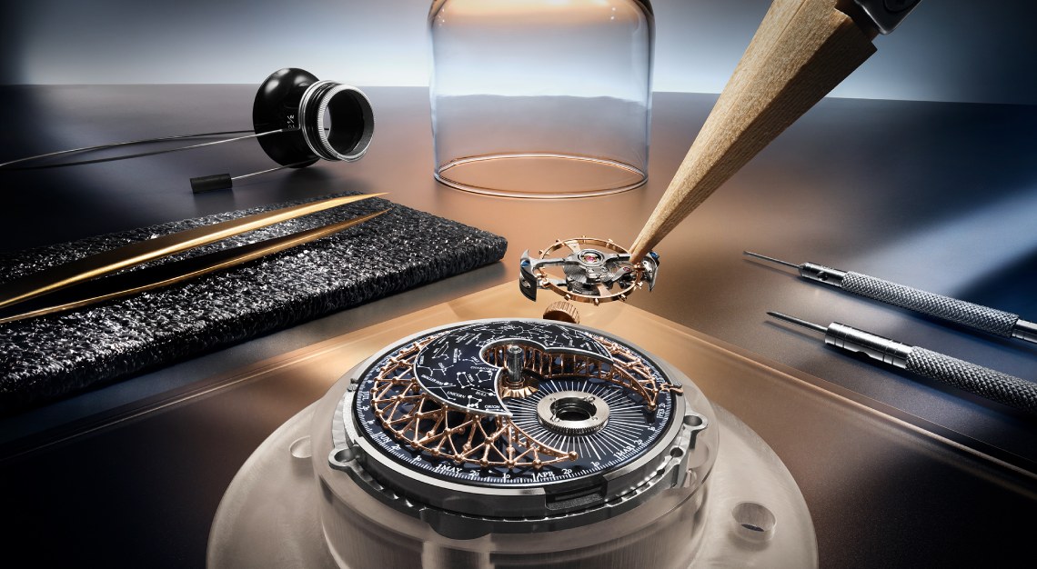 At first glance, it’s hard not to be drawn in by the dome-shaped dial, a canvas of deep blue grand feu enamel scattered with the constellations of the northern hemisphere. Suspended above it is a lattice of 117 tiny gold spheres, forming an abstract web that seems to connect the stars. Beneath the theatrical display is, fittingly, one of Jaeger-LeCoultre’s most extraordinary movements: the hand-wound Calibre 945. Made up of 570 components, the movement features what the brand calls a Cosmotourbillon. The rotating tourbillon mechanism not only regulates time by nullifying the effects of gravity on precision, but also carries the star map in a slow, graceful orbit around the dial.