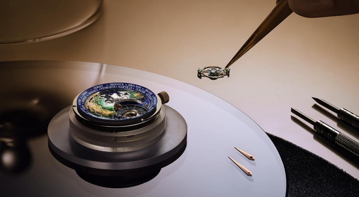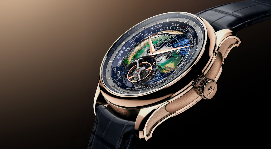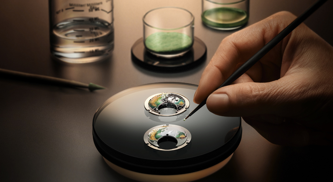 Again, the remarkable decorative artistry of Jaeger-LeCoultre draws one in before unveiling the watch’s technical virtues. On the dial, a domed map appears to hover under the sapphire crystal, its continents hand-painted in graduated green and earth tones. Meanwhile, the oceans are depicted using the champleve enamel technique. Last, but certainly not least, a skeletonised grid of longitudes and latitudes traces the planet’s geometry, giving the impression that you’re looking at a miniature globe suspended in orbit.