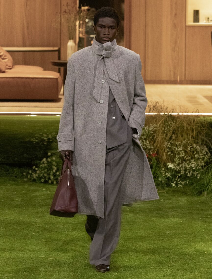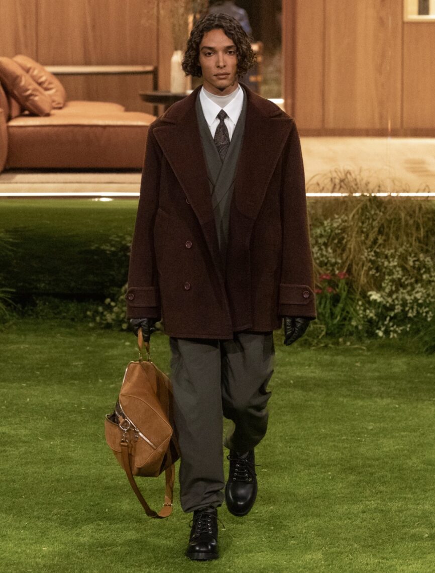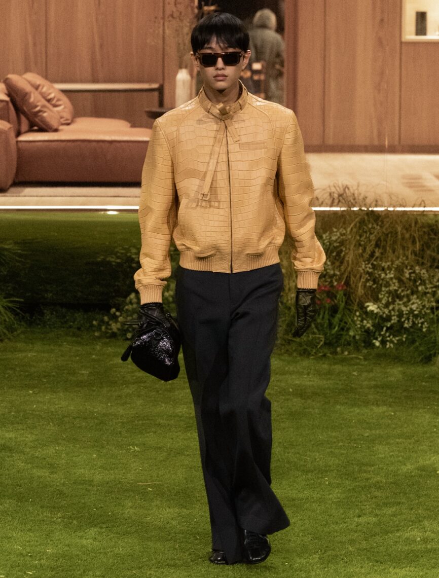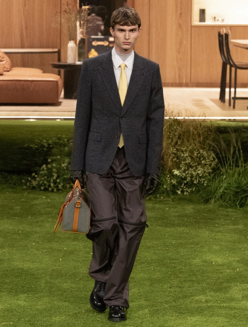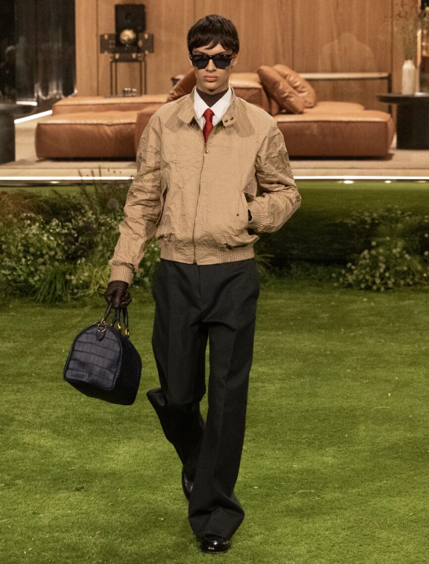 The silhouettes, while classic, envision a “future dandy,” blending softly tailored 1980s-inspired elegance with casual volume. Reversible parkas, mock-neck underlayers, and sporty new suits create a quietly futuristic tone, while the grounded palette of earth tones—beige, grey, brown—are punctuated with bursts of red, orange, and blue. Droplets appeared as a recurring motif, symbolising the ripple effect of small actions shaping the future. Crystal droplets adorned bouclé coats, shell jackets, denim trousers, and even a Keepall bearing 11,000 crystals.