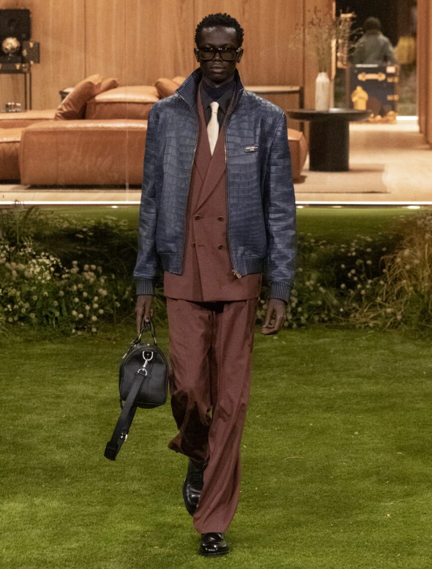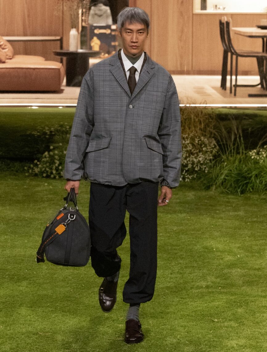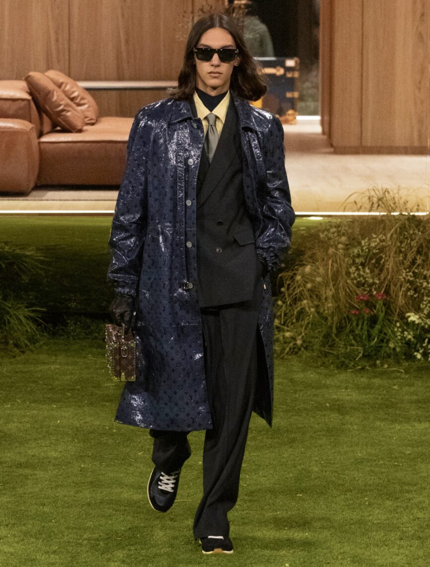 Within this environment, Williams returns to classic menswear archetypes—overcoats, double-breasted suits, tailored trousers—but executed with technical rigour and subtle innovation. Timeless Textiles, developed by artisans of the Louis Vuitton Studio Homme, elevate these silhouettes: reflective houndstooths and checks, thermo-adaptive silk and chambray jackets, aluminium-weave fabrics sculpting with body movement, and breathable, lightweight casual or formal textiles. Trompe l’oeil details blur reality and illusion: nylon masquerading as silk, mink evoking towelling, and woven tops revealing hidden Monogram patterns when stretched. Every garment’s engineered to perform beyond appearance—breathing, adapting, and protecting—reinforcing a view of luxury defined by utility and durability.