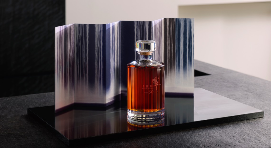 The Hibiki 30 Years Old is encased in a traditional byōbu-style display with multi-panel screens, complete with a reflective base. Photo by House of Suntory