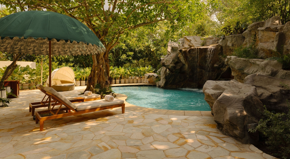 Raffles Sentosa Spa features various pools, including a lap pool, mud pool, outdoor whirlpool, waterfall-fed pools, and hot and cold plunge pools. Photo by Raffles Sentosa