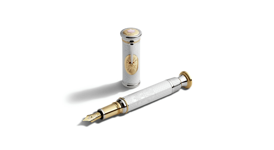 Montblanc High Artistry: A Journey through Château de Versailles Limited Edition 479 is inspired by the King’s Corner Room has a translucent white lacquered body This is complemented by solid Au 750 yellow gold fittings that pay homage to the palace’s gilded decor. Beneath the lacquer work echoes the chamber’s intricate detailing. The cap top is crowned with the Montblanc emblem in mother-of-pearl, set in solid Au 750 yellow gold.