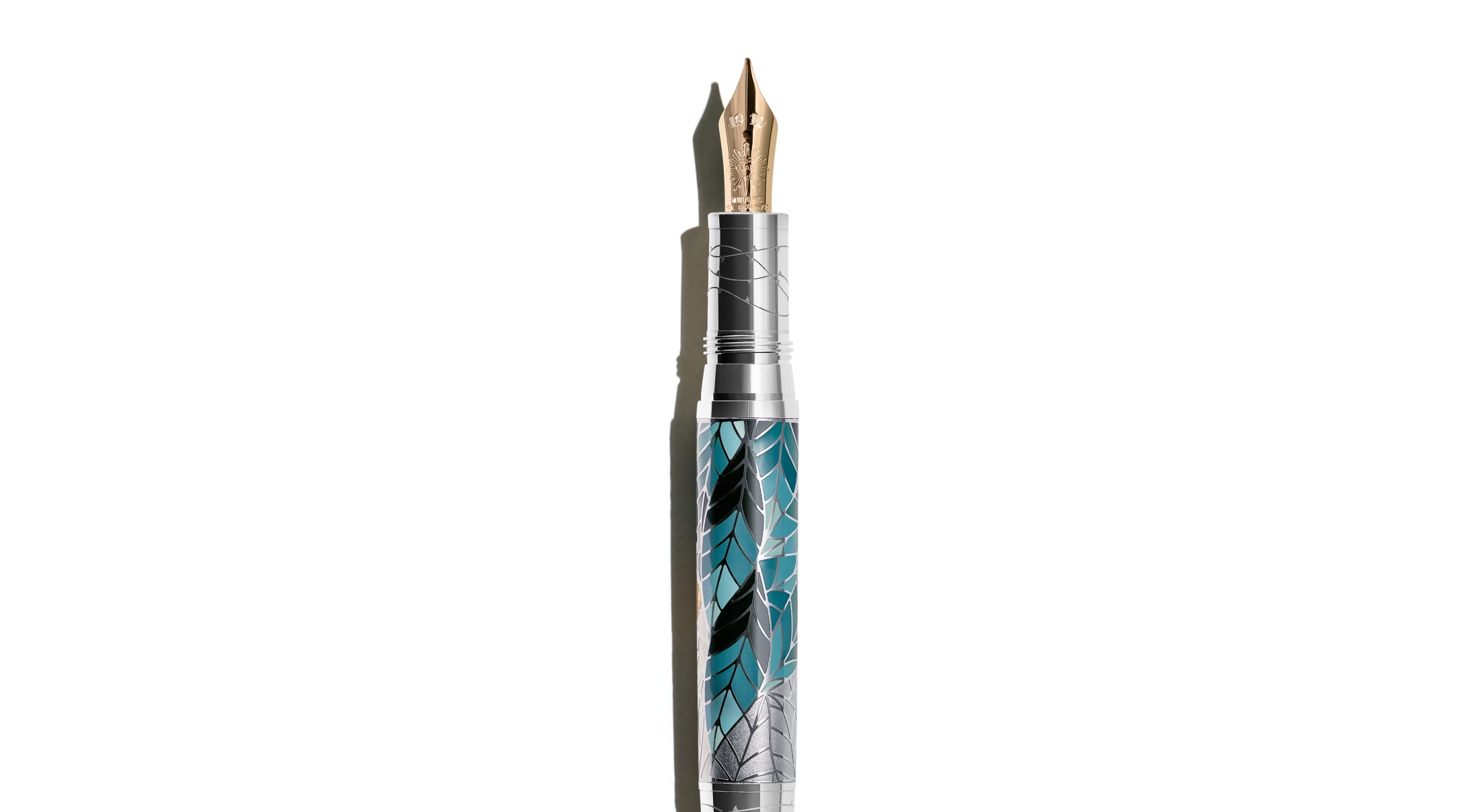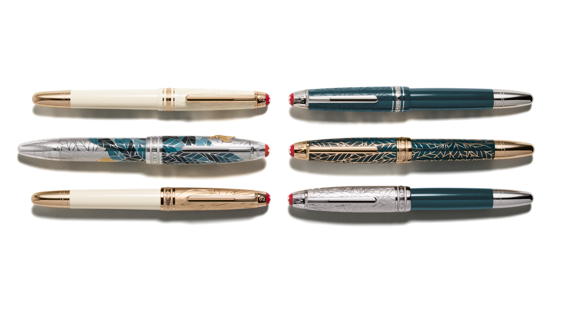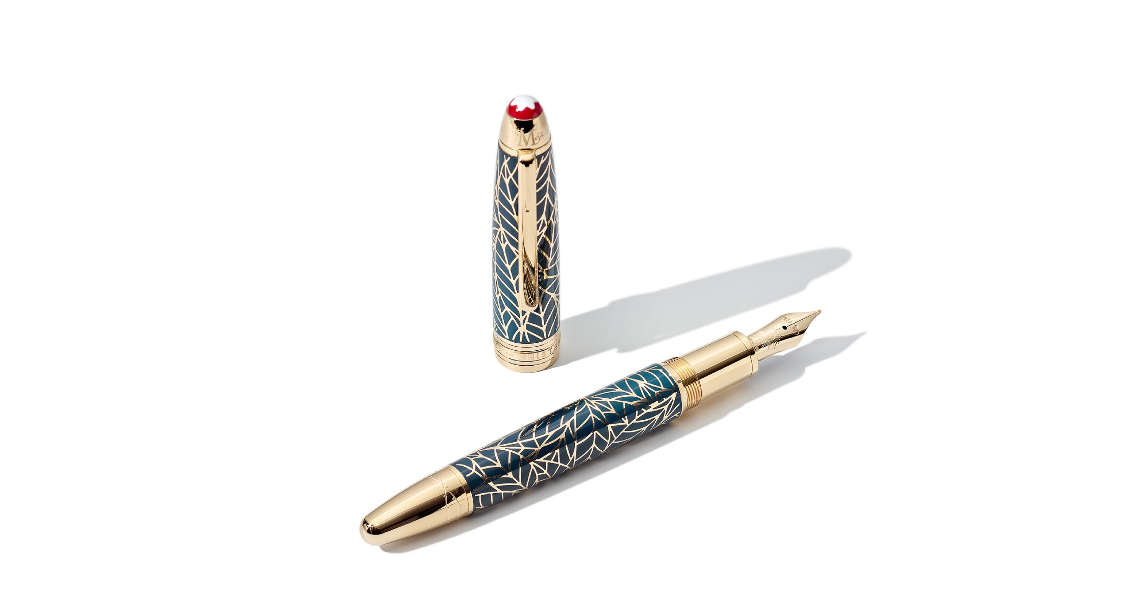 The Meisterstück Romeo Precious Resin LeGrand, meanwhile, trades the warm hues of the Juliet editions for a cooler register. Deep teal replaces cream for the precious resin barrel, while leaf engravings take the place of feathers along the cap. Platinum-coated fittings further temper the design, while thorn motifs remain present at the cap top and cone, maintaining a visual link to the rest of the collection. The cap top is engraved with the letter “M,” referencing the Montague family, and the rhodium-coated gold nib is inscribed with the name “Romeo.”