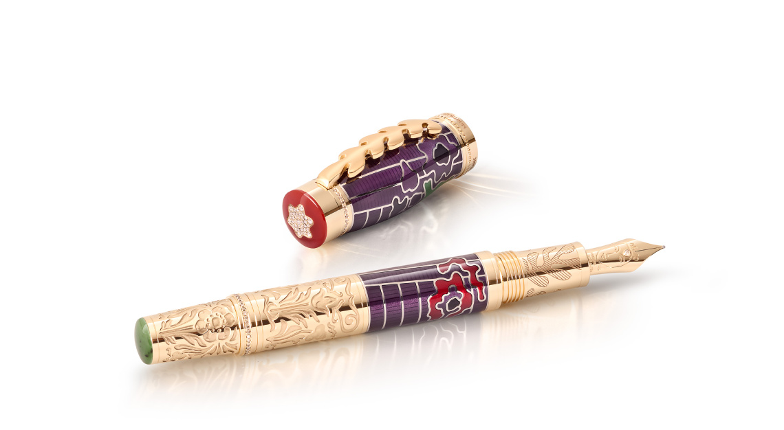 Meanwhile, the Limited Edition 888 recalls The Romanian Blouse (1940), a painting that reveals Matisse’s lifelong captivation with fabric, an expressive force in its own right. Its red and blue lacquered cap and barrel evoke the weave and palette of the canvas, offset by a solid gold cone engraved with the blouse’s embroidered motifs, and a gold nib bearing the likeness of Large Face (Mask).