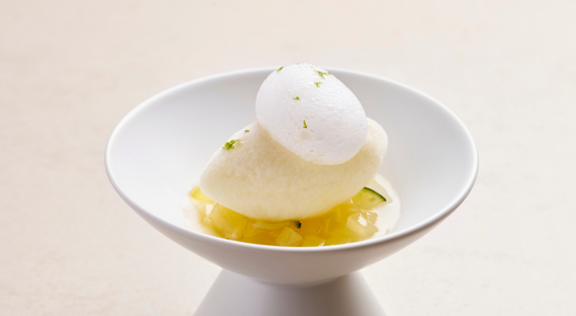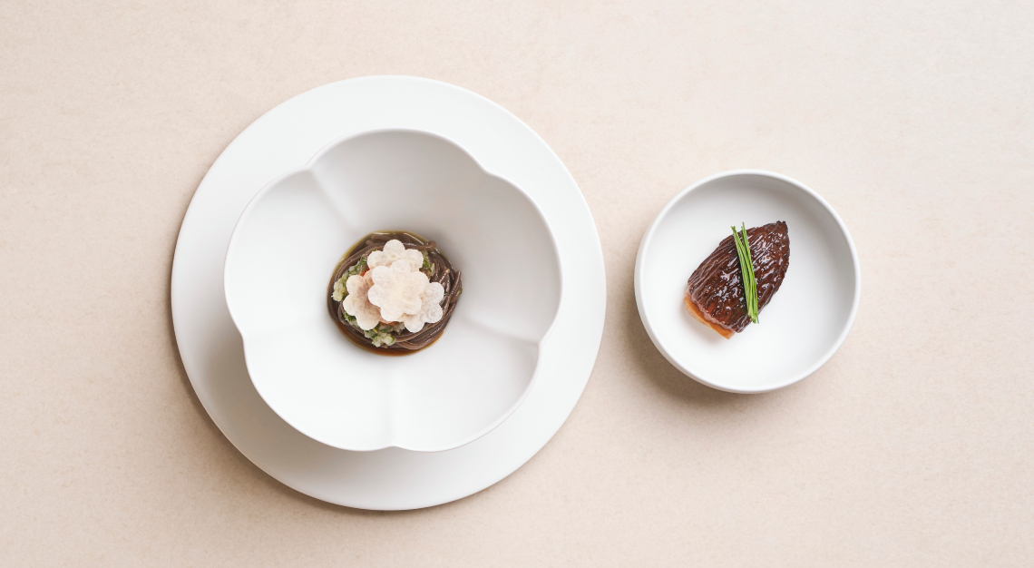 Another dish that reflects Han’s personal history may appear simple but is profoundly comforting is Memilmyeon & Mandu. The buckwheat noodles are served with white kimchi and a side of morel mushroom dumplings. This dish symbolises his moment of joy, sharing a meal with his family. It features Korean buckwheat noodles layered with cured tobiko sauce, pickled cucumber, and mountain turnip, paired with a morel mushroom dumpling stuffed with tender duck meat, an ode to home and heritage.