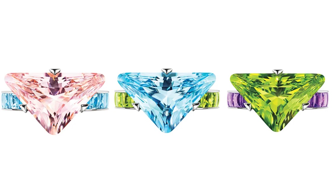 The design is echoed throughout the collection, emphasised in a group of four rings. A Prada Cut peridot perched atop suiffé amethysts and set in 18-karat white gold, for instance, will surely turn heads from across a room. But the company’s geometric symbol can be found in more subtle forms as well. The smaller suiffé stones on tennis bracelets and necklaces blend a round-cabochon top with a French-cut base faceted into four triangles.