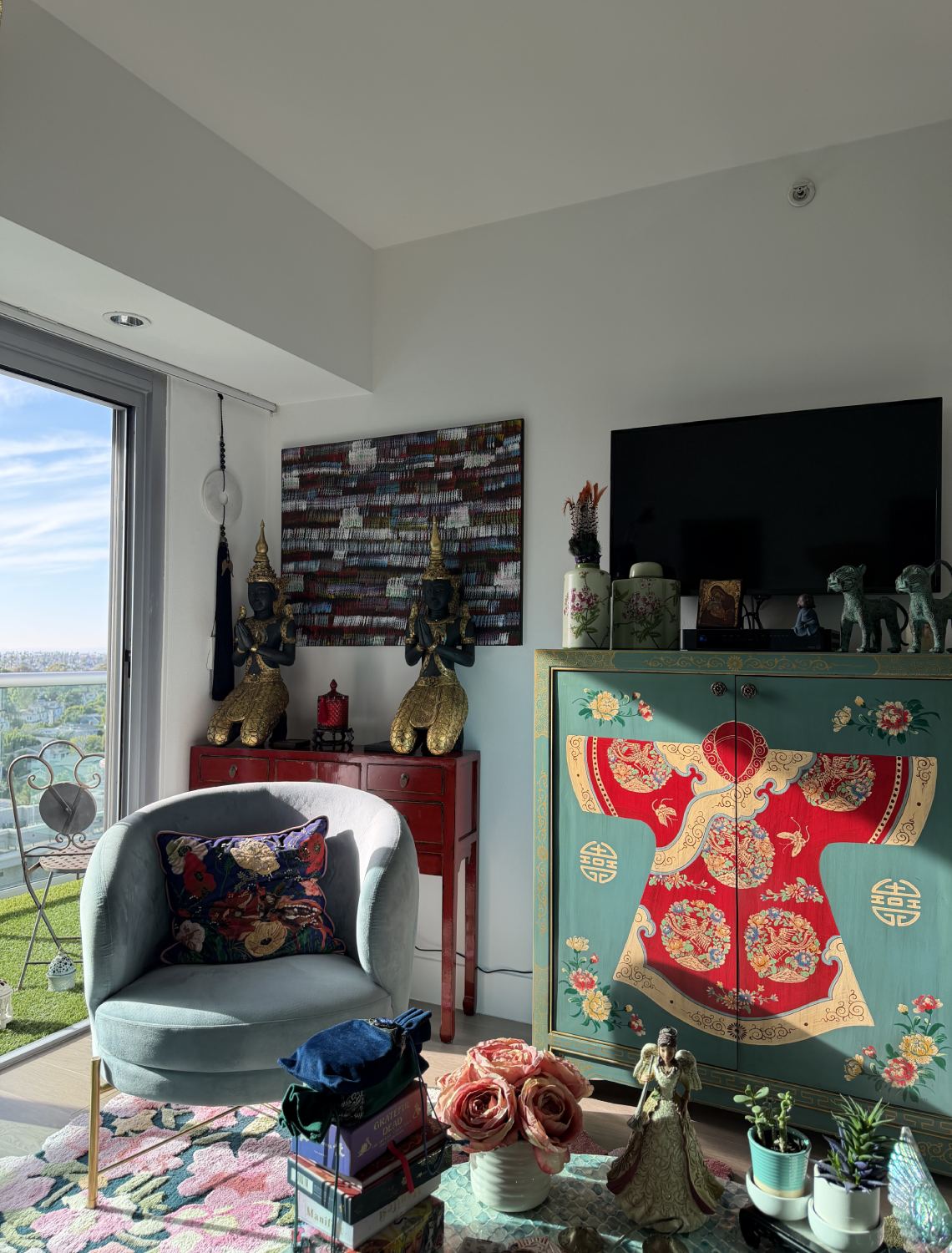 Instead of editing them out, we introduced them into the decor: the koi painting became an anchor, while her father’s artefacts, lamp and pendant brought warmth and legacy into a room that had once felt beautiful, but distant and devoid of emotion.
