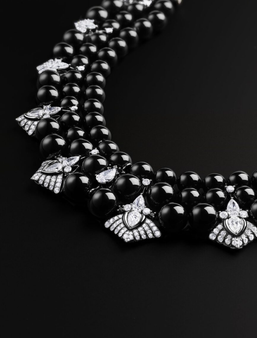 The concept of chiaroscuro—the interplay of light and shadow—comes to life in the onyx necklace. More than 650 carats of generously sized onyx beads form a drape, from which over 20 carats of pear-shaped and brilliant-cut diamonds emerge in crystalline clusters, all set in 18-carat ethical white gold and accented with black diamond pavé. The effect suggests light rising from the depths, with each movement revealing a new constellation along the neckline.