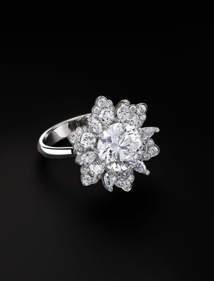 At the heart of the collection is a ring in 18-carat ethical white gold, crowned by a 2.77-carat brilliant-cut diamond. Its setting evokes the delicate geometry of a snowflake, inspired by the snow-capped mountains visible from Chopard’s Geneva ateliers during the winter months. At a glance, the ring captures that fleeting moment when light dances across freshly fallen snow.