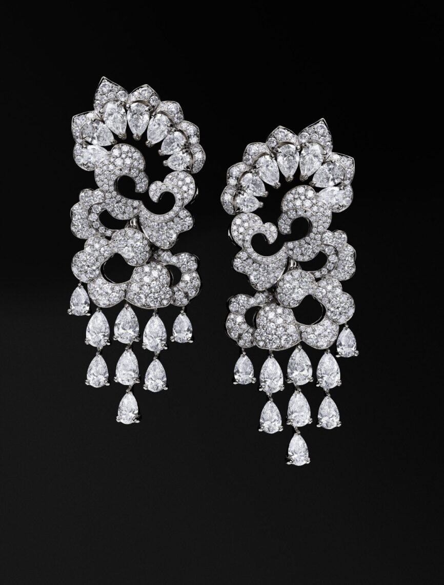 Completing the ensemble, lace-like earrings reinterpret one of Chopard’s signature volute motifs. Crafted in 18-carat ethical white gold and set with more than 10 carats of pear-shaped and brilliant-cut diamonds, the design traces the curve of the ear before dissolving into fluid strands that shimmer like droplets of light. With every turn of the head, the diamonds catch and release radiance, framing the face in an almost liquid brilliance.