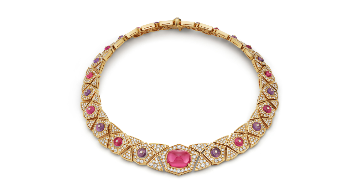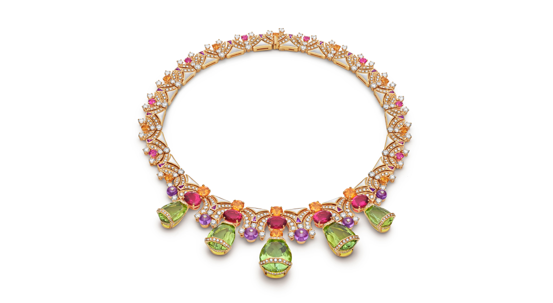 When the mood calls for a night of revelry, Bvlgari answers with Rhapsody of Colour, a set that treats gemstones like notes in a chromatic symphony. The necklace, earrings, and brooch come alive with green tourmalines, rubellites, mandarin garnets, amethysts, and mother-of-pearl, all illuminated by pavé diamonds. Five pear-shaped green tourmalines form the flowing focal line of the necklace, while rubellites, amethyst beads, and mandarin garnets build layers of warmth and rhythm. Iridescent mother-of-pearl softens the contrasts, adding gentle luminosity. The earrings mirror this finely calibrated balance on a more intimate scale, turning every movement into a quiet, colourful crescendo—a testament to Bvlgari’s confident mastery of colour.