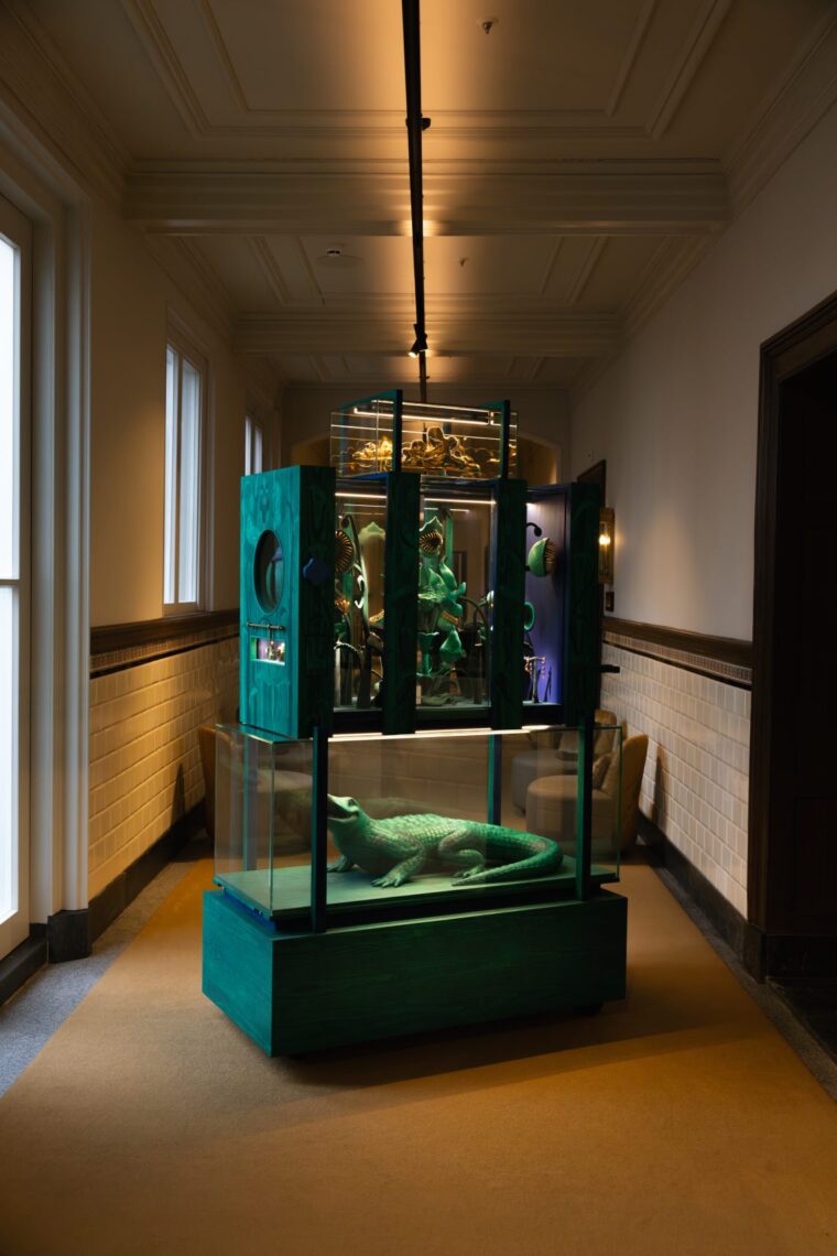Among a dreamlike jungle built with an elemental togetherness—plants brushed with gold leaf, ceramic clouds gilded in gold, an alligator symbolising water and a scarab automaton that brings the idea of rebirth and transformation to life—is a rotating collection of 30 signature pieces and one-of-a-kind creations from the artist’s most iconic collections. Made of 18k recycled gold and set with the most extraordinary materials, such as ancient mammoth tusk and malachite, each piece embodies the hotel’s ethos of refined innovation and modern heritage.