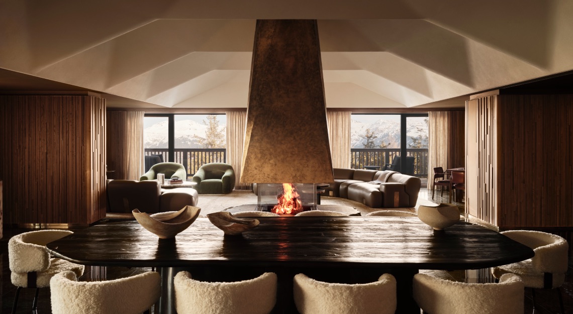 Behind a facade composed of Vals Quartzite, warm wood and copper accents, the property features 51 thoughtfully designed rooms, suites and penthouses, each maintaining a constant dialogue with the surrounding mountains. Designed by the acclaimed Tristan Auer, every room has a private seated terrace, an effortless extension of the living space to the outdoors, allowing guests to take in sweeping views of the snow-covered peaks.