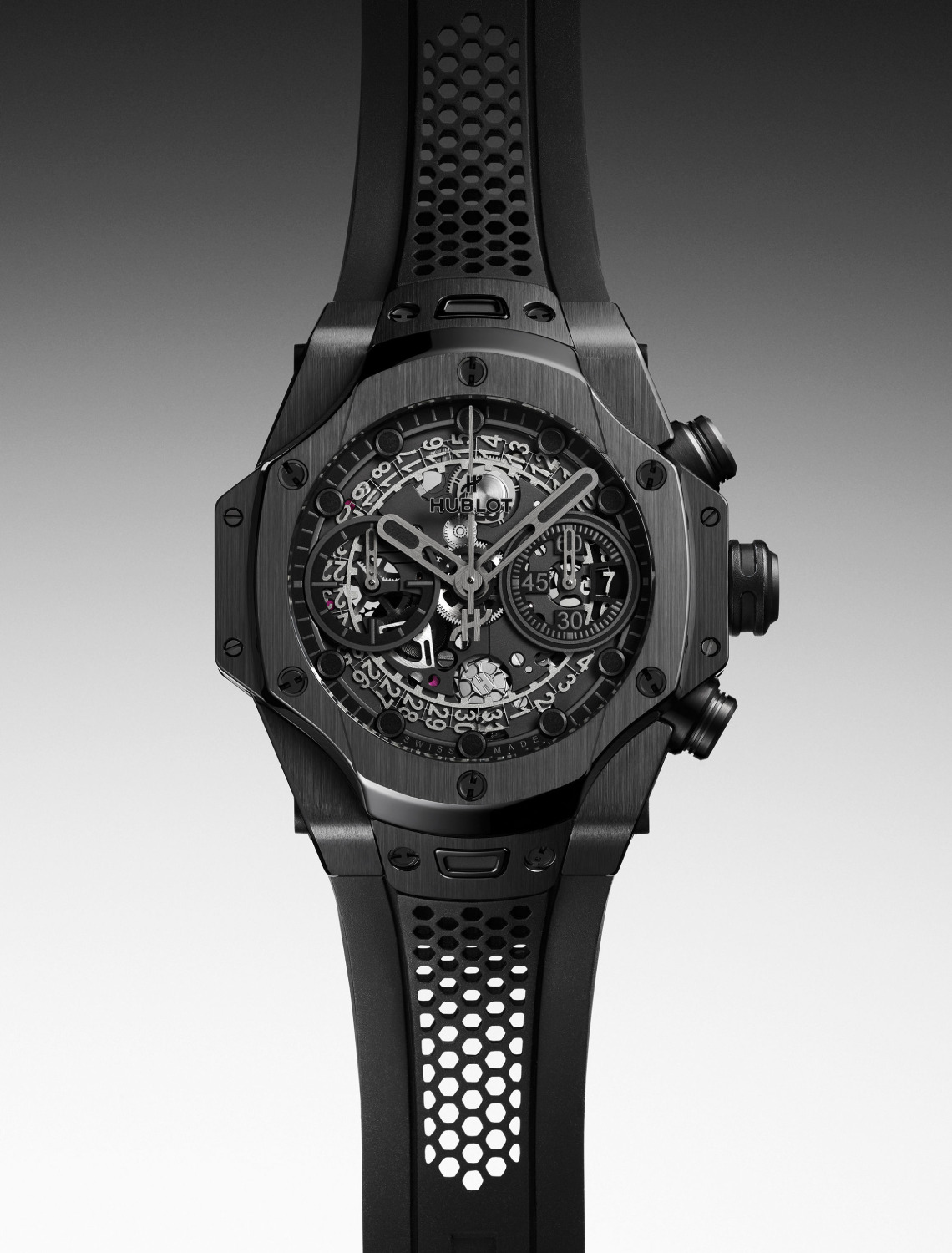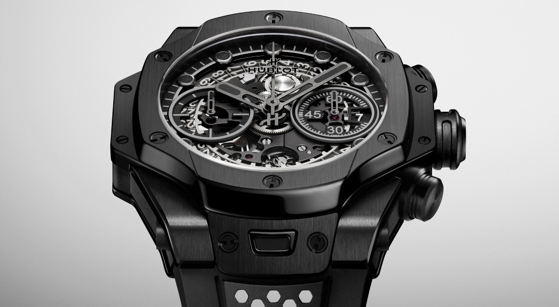 The watches’ protruding side lugs, multi-layered case construction, and juxtaposition of different shapes as well as its signature honeycomb shaped motifs make them unmistakable. Even though the Hublot Big Bang Unico SR_A differs from its colourful, titanium-clad predecessors with its monochromatic sheen, and its steel and ceramic construction, it is an unambiguously Samuel Ross and Hublot lovechild.