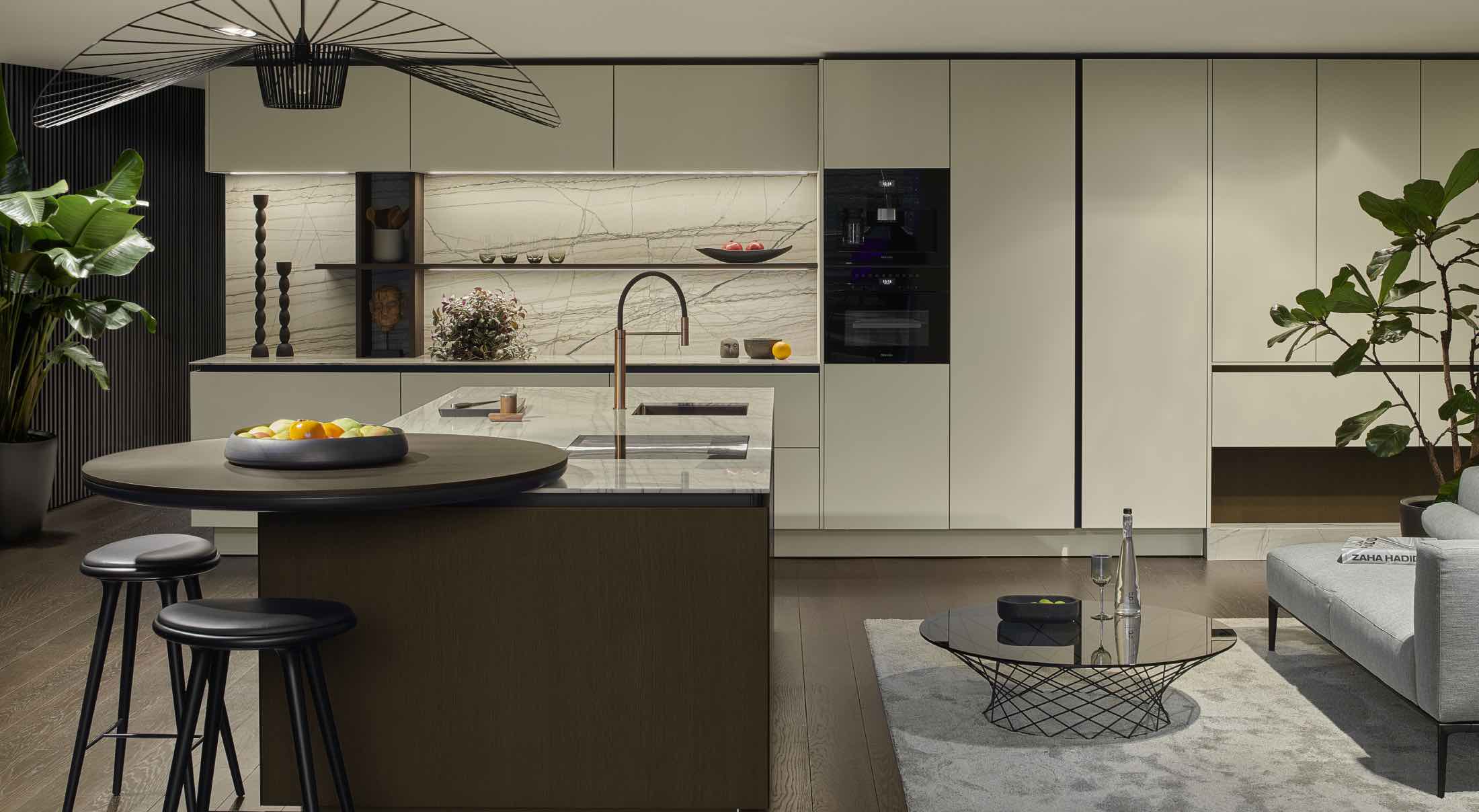 The S2 is also designed as a central element within the home. Tall cabinet units can extend up to seven metres, offering generous storage without overwhelming the room. Circular tabletops in matching finishes create informal spots for dining or work. The result is a kitchen that integrates seamlessly into its environment, supporting both everyday tasks and social occasions with versatility and elegance.