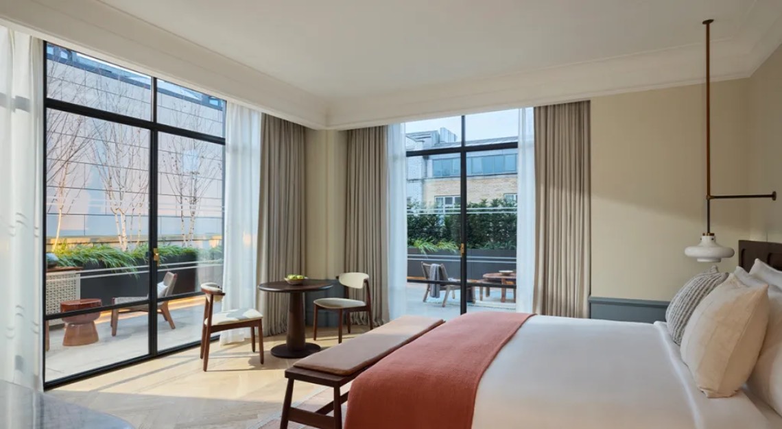 The interiors got a contemporary upgrade courtesy of AvroKO, as well as the teams at EPR Architects and Foster + Partners. A Premier room, for one, is home to a glass-encased shower along with touches of terra-cotta and blue hues. The Junior Corner Terrace Suite, meanwhile, is wrapped in its own balcony, paired with a green-tiled bathroom that even has its own door leading outside. As for the Notting Hill Suite (paging Julia Roberts), those digs come with a balcony, too, complete with a picnic table and plenty of lounging areas; the accommodation also places a tub right in your bedroom and offers up a living room and kitchen.