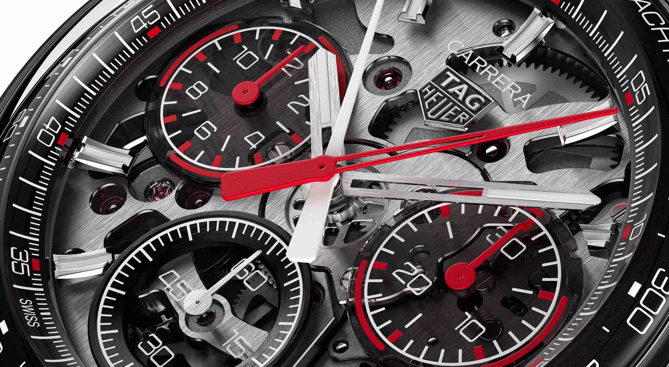 The split-seconds mechanism is operated via a third pusher integrated into the case flank at 9 o’clock, joining the elongated chronograph pushers at two and four. Powering the watch is the TH81-01 calibre, developed in collaboration with Vaucher Manufacture Fleurier. Beating at 5Hz, the movement combines high-frequency precision with extensive hand-finishing, including black-polished screws, hand-bevelled bridges, and TAG Heuer’s checkered-flag motif, visible through both the sapphire dial and caseback.