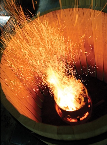 The cask is returned to the flame to toast the interior. Depending on the client’s winemaking style, barrels can be fired to light, medium, medium-plus or heavy levels of char. In general, the toastier the barrel, the less wood influence will be noted on the palate when tasting the final product. Modern-day toasting is a combination of high-tech and traditional methods: It involves an infrared pyrometer with a laser sight but is performed over braziers tended by a single worker feeding them leftover oak.