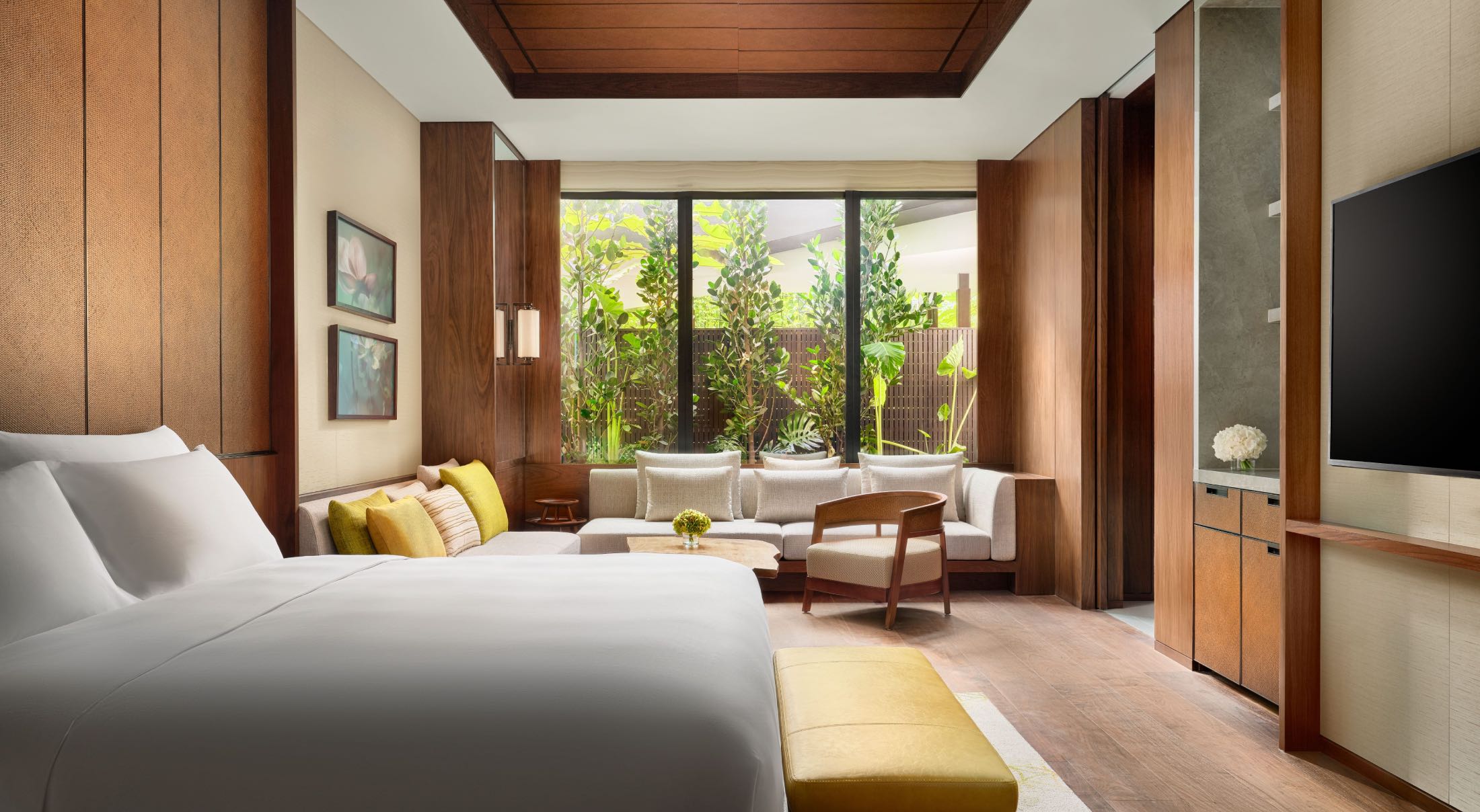 Keep your eyes fixed on the hotel’s spanking new grand lobby. Just above the reception area dangles a stunning art installation designed by Japanese artist Hirotoshi Sawada. Thousands of gold and silver cascading leaves dance as rays of light bounce off them, creating an illusion of a tree canopy. To the left, a nine-metre basalt rock feature stands tall in the lobby lounge, accompanied by ferns, potted trees, a reflection pool, and sculptures of children playing by the water.